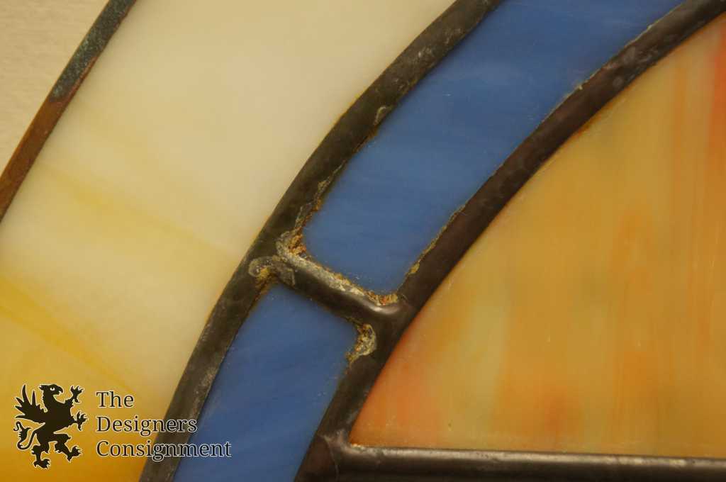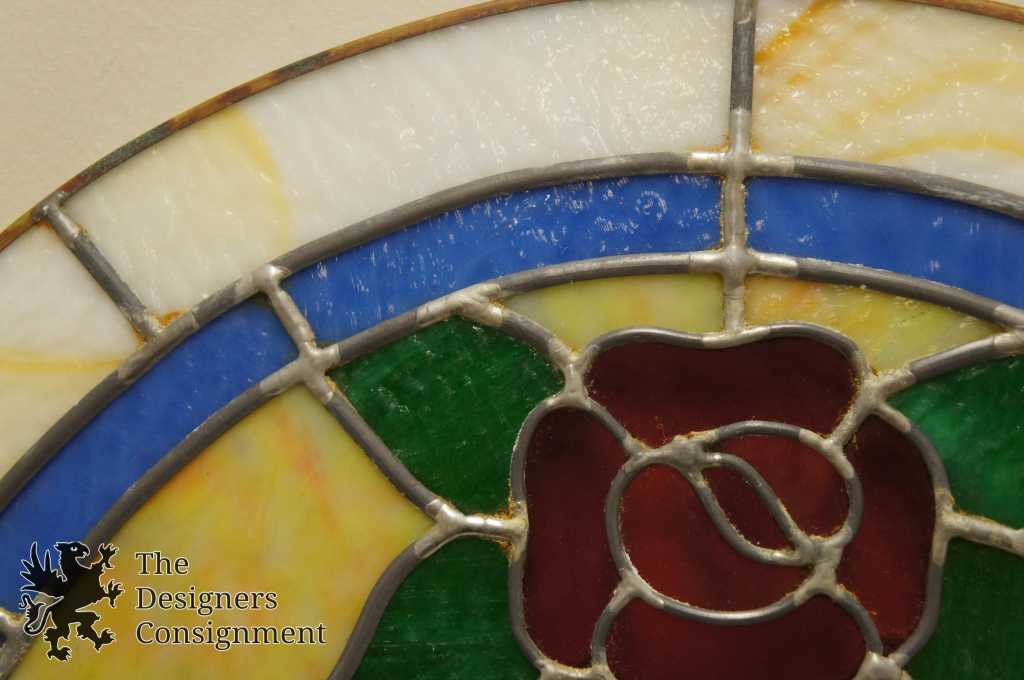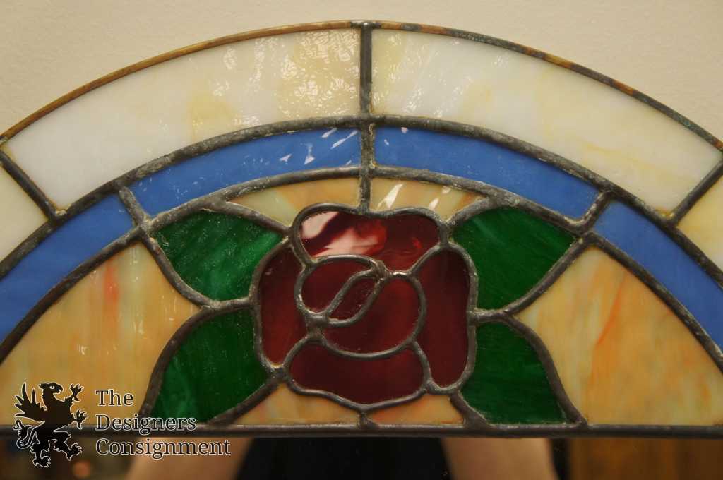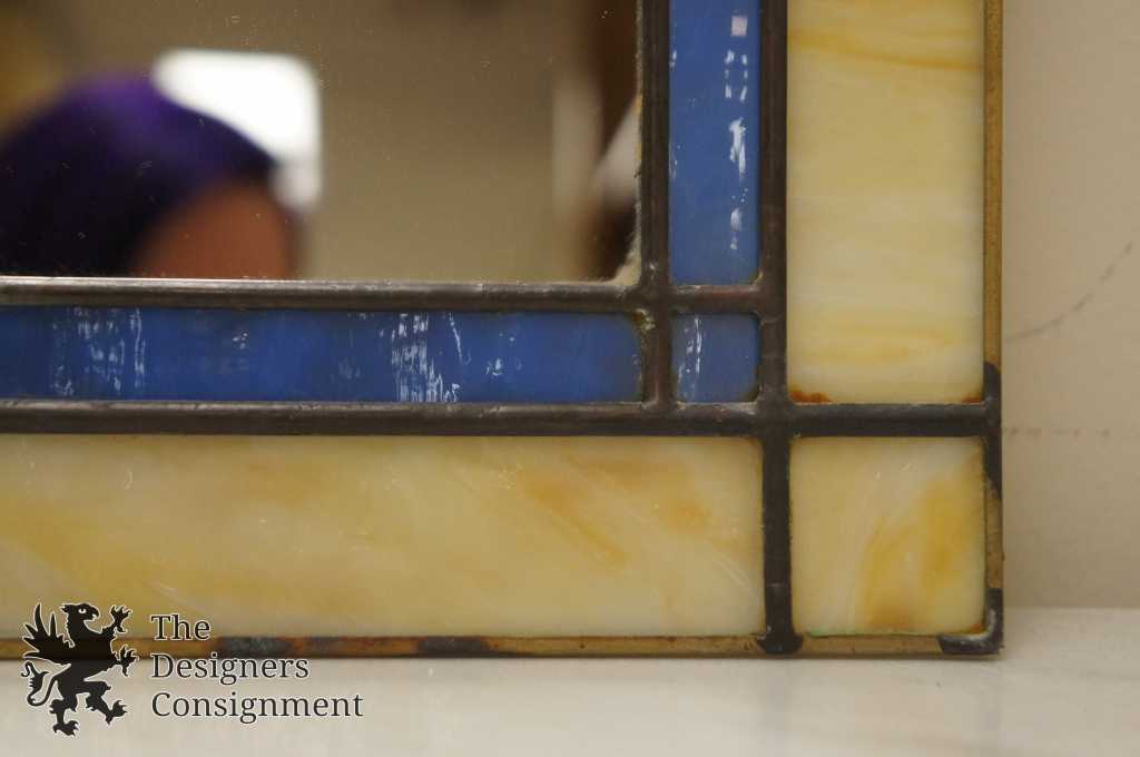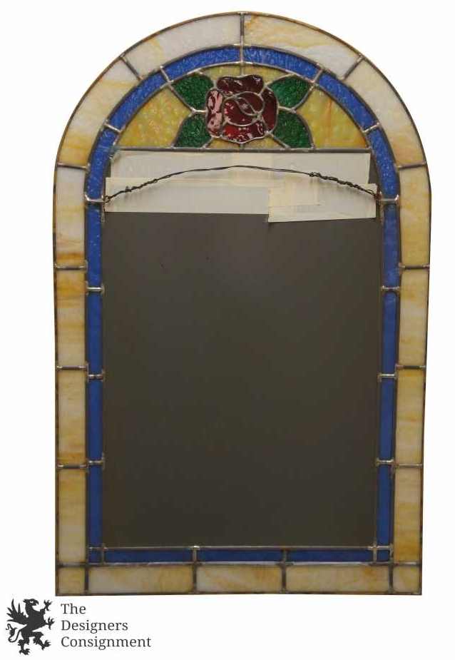The perfect accent to any entry or bathroom. This leaded stained glass mirror features an arched design with a floral pattern. The frame is made up of vibrant amber and blue glass with hints of green and red.