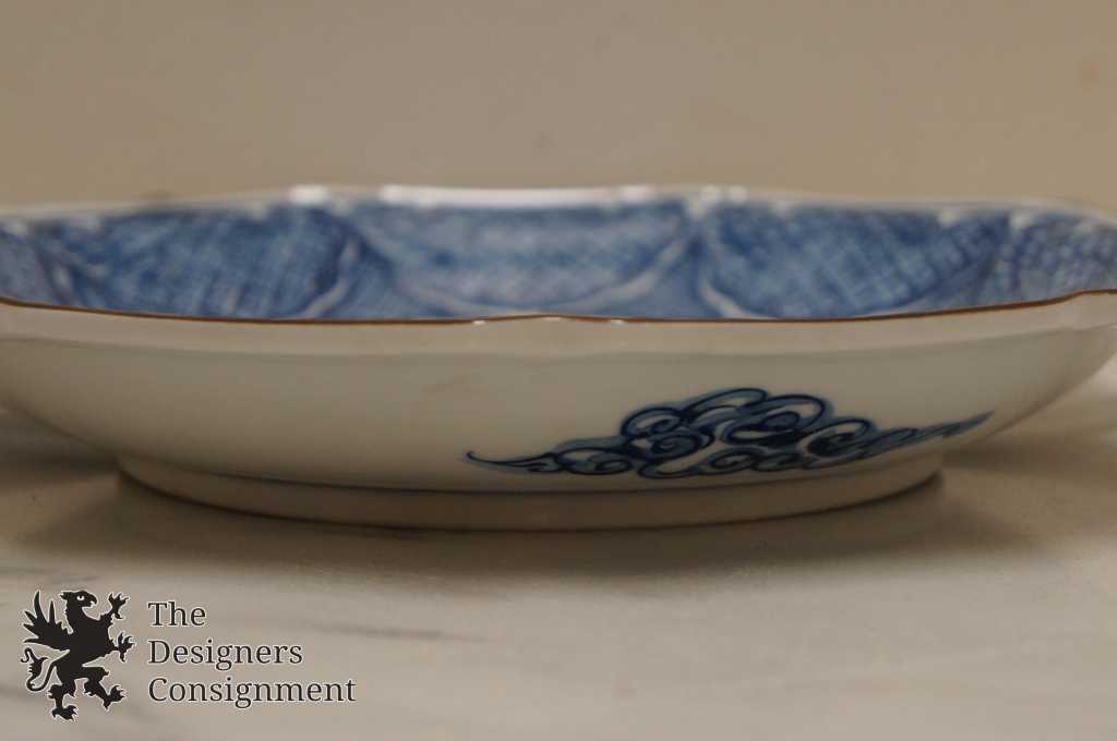 Takahashi transferware plate. Blue and white with gold trim. The plate has a lattice work design around the border and a floral lion theme at the center. A neat display piece for any setting.