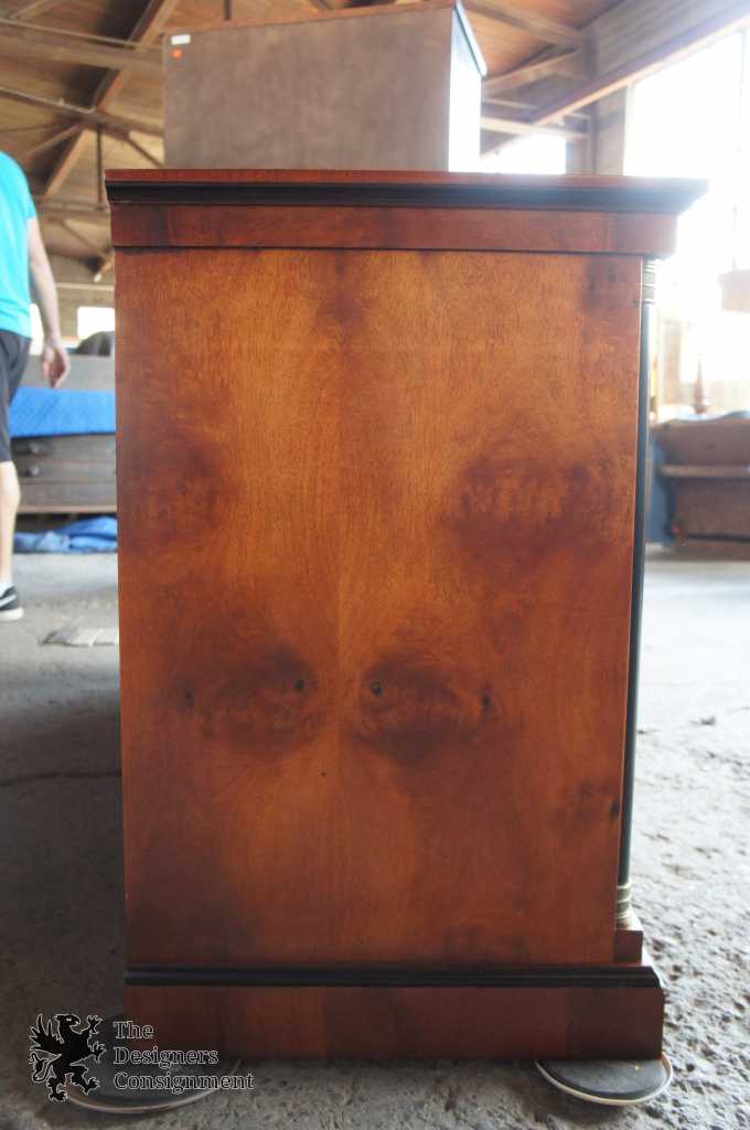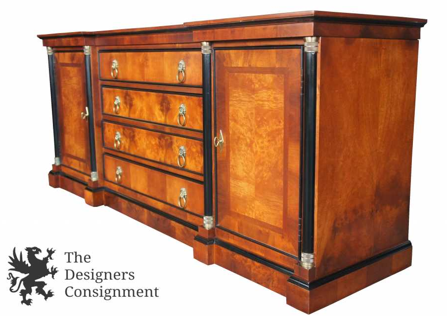 ( 1914-2010). The buffet has two side cabinets and four center dovetail constructed drawers with original brass drawer pulls . The top drawer has felted silverware insert. Four Neoclassic ebonized columns adorn the face of the buffet. Beautifully matched veneers on drawer fronts and cabinet doors which are detailed with book and butt-matched myrtle burl sketch faces. The top of the piece is also crafted with a wood veneer sketch which emphasizes the contrast between the light and dark wood coloration.