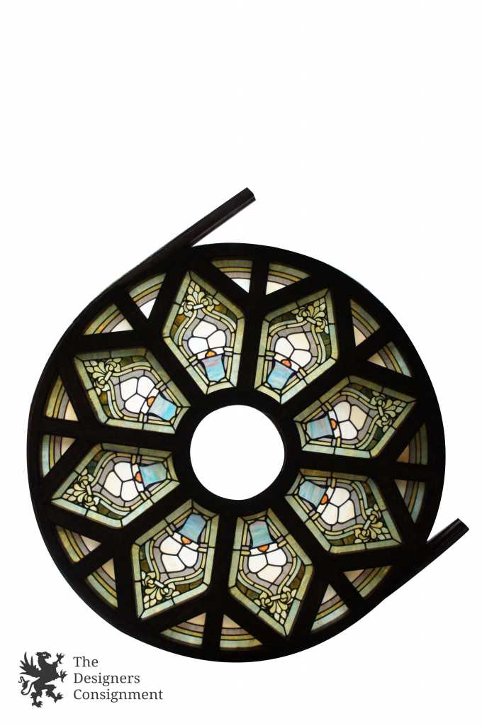 Up for consideration is a massive circular leaded stained glass window. Circa 1880-1890. This window came from the Old Central Christian Church built in 1890 at 29 Brown St in Dayton, Ohio. The window which is in exceptional condition for its age features vibrant greens, blues, amber and hints of red. Set in a 7" thick oval frame with a white painted finish on one side, and natural wood along the other. An amazing piece architectural salvage that will make a statement in any setting.