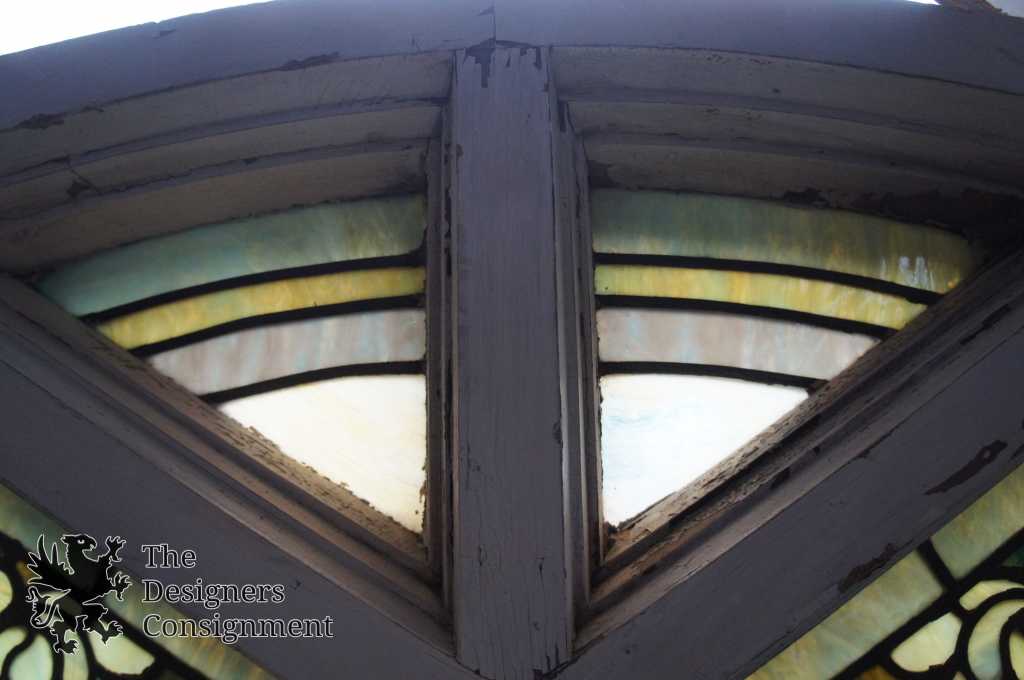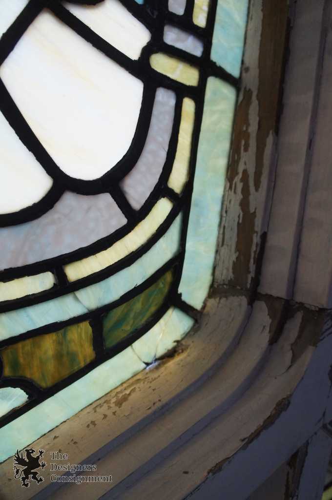 The window is in very good shape for its age. The central panel which once sat in the middle is no longer with it. There are some small hairlines in the slag glass. I was only able to find one tiny chip where the light is let through. This can be seen in the last photo. There is some paint loss on the white side from over a centuries use and some molding missing.
