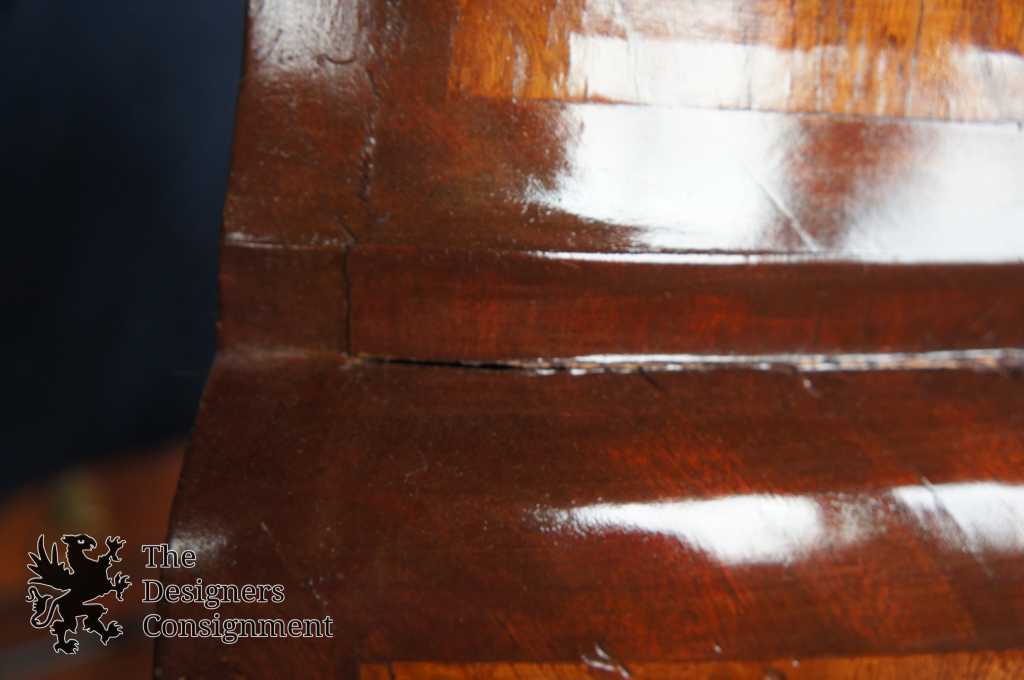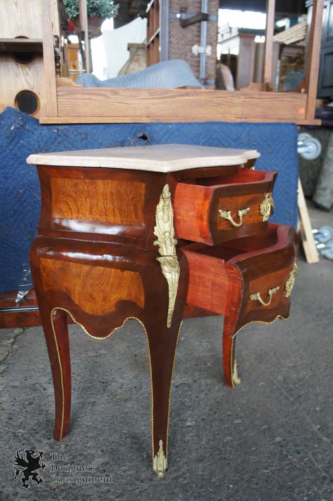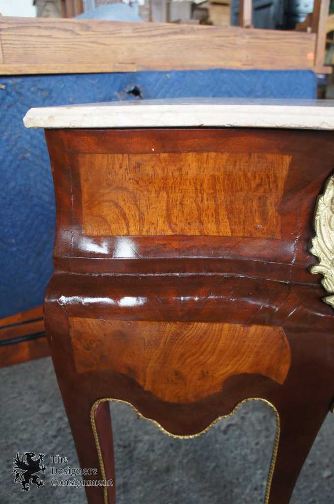 C. 1960s Louis XV style Bombe chest. Mounted with gilt hardware and light pink marble top. Made from Mahogany with an exotic burl inlay. A neat addition to any setting.