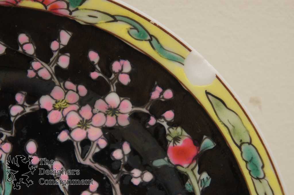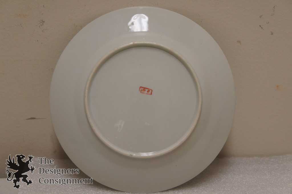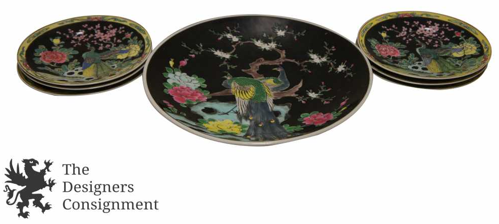 Chinese hand painted peacock and floral plates. Features one dinners and 6 bread & Butter plates. Each plate is meticulously detailed with vibrant color and detail. There is a stamp into the plate of one, while the others have red rubber stamps.