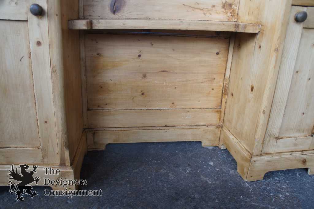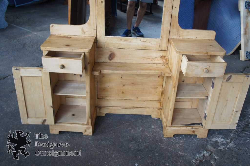 Up for consideration is a beautiful slimline primitive that could be used in an entryway, or as a dressing table. A handmade early 20th century danish vanity that was imported from England. The buyer was originally informed mid to late 1800s, but we have this piece pinned to the earlier part of the 20th century. Made from an unfinished pine giving rustic character. At the center is an adjustable mirror and table surface that is flanked by a drawer and lower cabinet along each side. Upon opening each interior cabinet has one fixed shelf. Drawers are dovetailed, and pulls are hand turned. A neat piece that will make for great conversation and use in any setting.