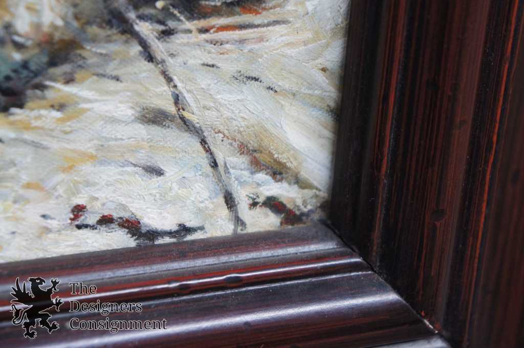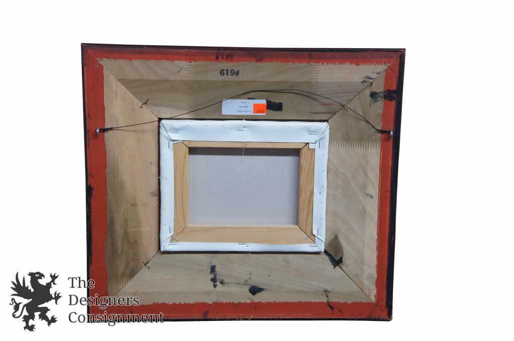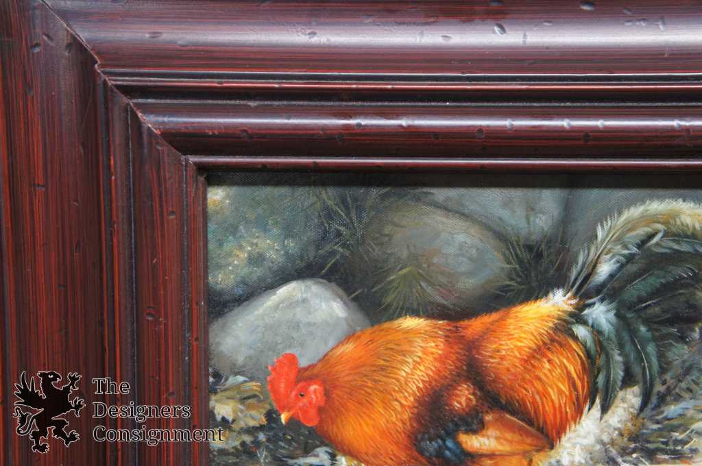 Standing rooster painted on canvas in mahogany finished frame with distressed accents. Unsigned, 20th century
