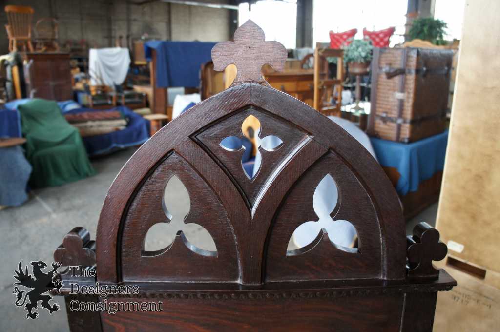 Up for consideration is an exquisite antique throne chair. Made from solid quartersawn (tiger) oak with a nice dark stain. Features a Gothic style with a pierced cathedral back. The three pierced panels show a clover design. The chair is topped with 3 finials in a fleur de lis fashion. Fabric is a goldish color with black accents in a brocade pattern. Upholstery shows riveted nail head trim. A very solid piece that will make a great addition to any setting.