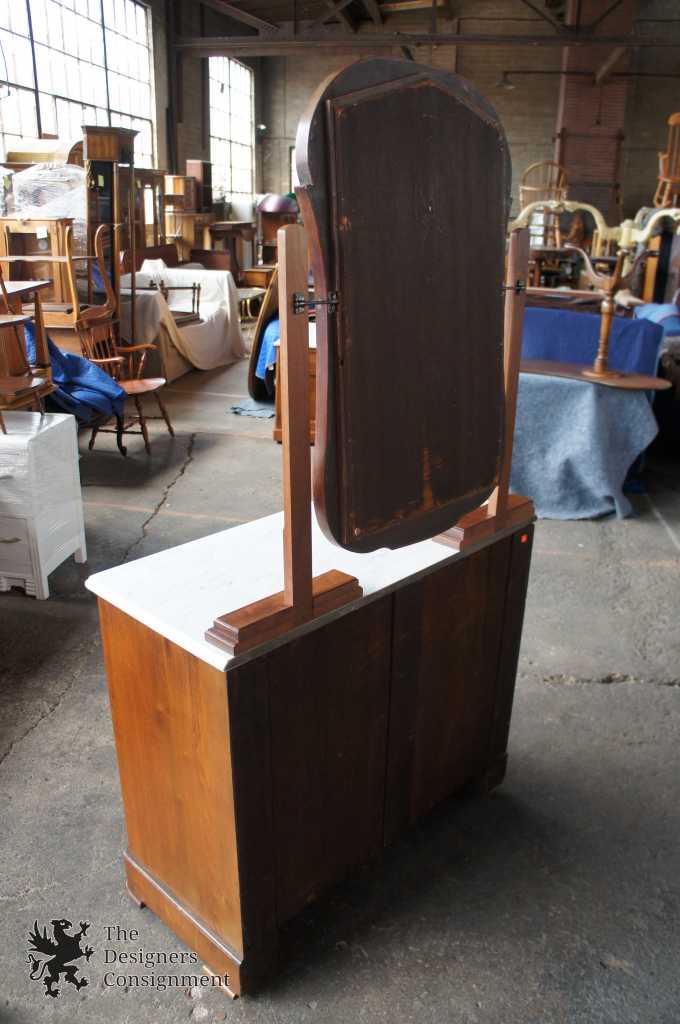 This piece is in very good condition. There is slight discoloration on the marble by the mirror supports. The supports have 2 settings allowing the to be moved forward slightly. We presume they were forward at one time which lead to the discoloration. They are currently flush to the back of the piece. The key to this piece is functional. See Pictures