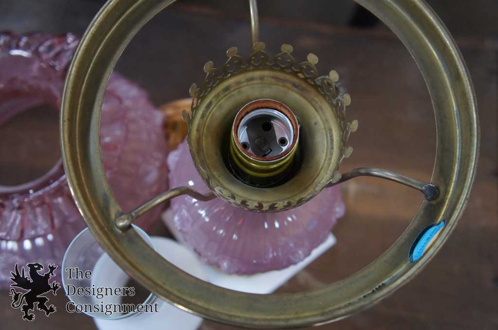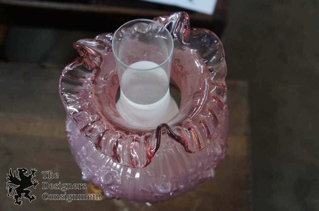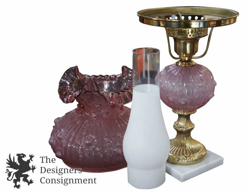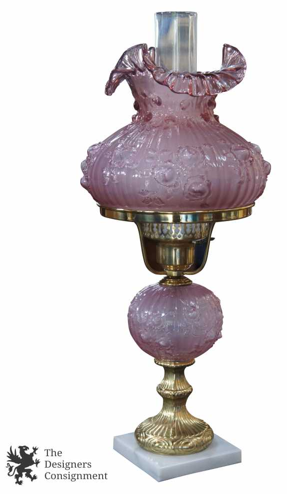 Gorgeous Fenton glass gone with the wind (hurricane) lamp. Made from a light purple glass with the cabbage rose pattern. The rest of the lamp is made from brass and is mounted on a marble base. A neat addition to any setting.