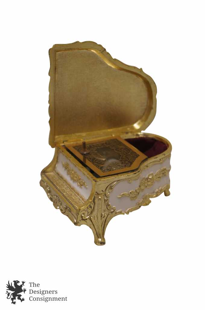 A beautifully designed piece by San Francisco Music Box Co. Made from porcelain with hand painted floral design and brass flourishes. Limoges style. The music box plays 'Fur Elise' by Beethoven. In addition there is a small space for trinket storage.