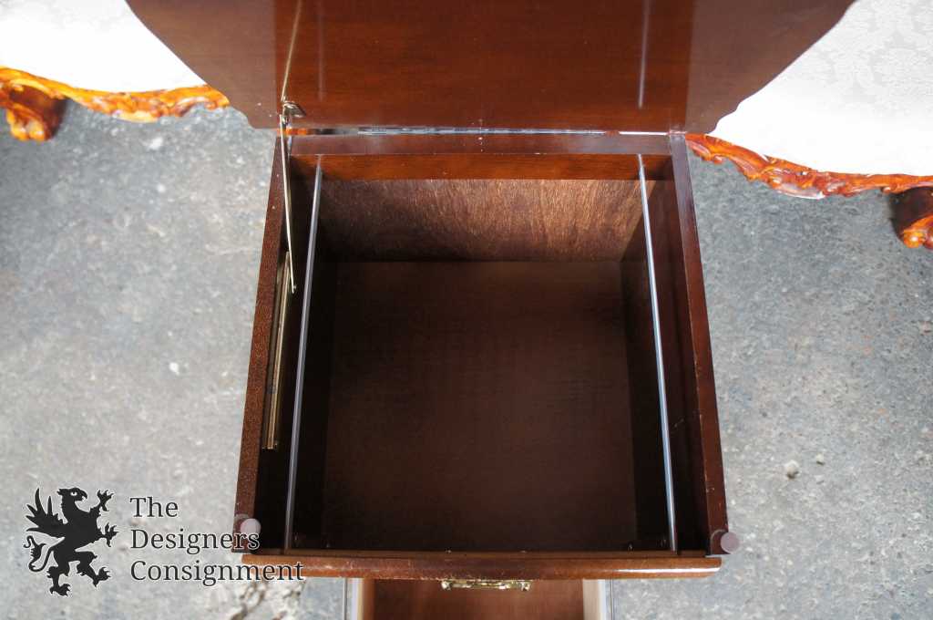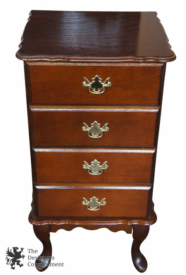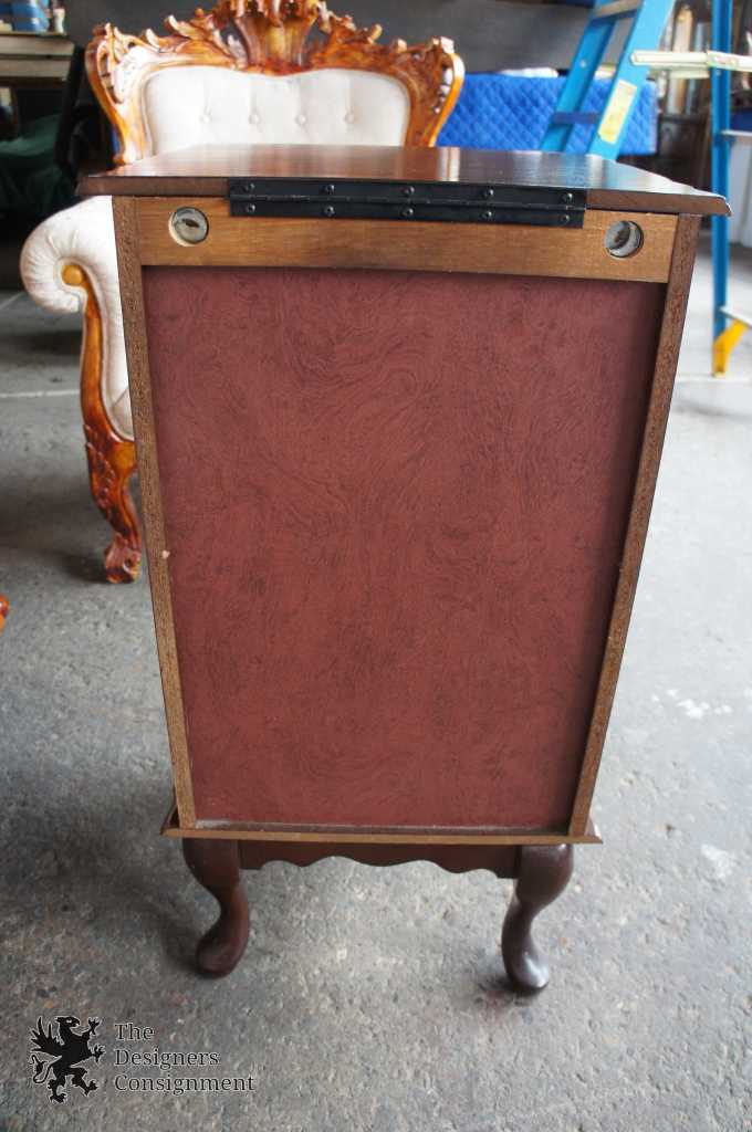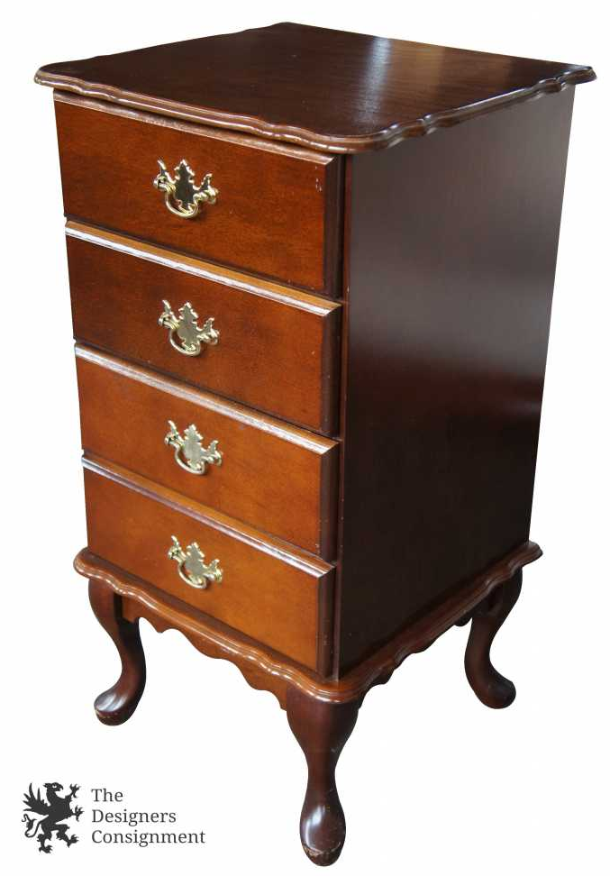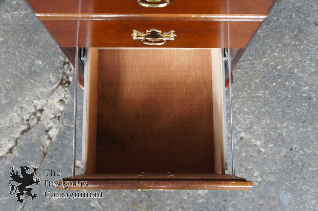The beautiful wooden Queen Anne Filing Cabinet makes metal look like a thing of the past. Top lifts to reveal a storage area for your letter-size files; bottom drawer offers additional storage space for files or supplies. Filing cabinet is made from hardwoods and veneers. Antique brass pulls give the appearance of drawers.