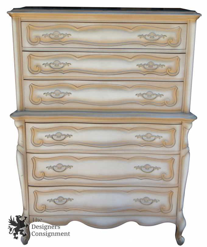 Bassett Furniture Industries Cartier Collection Chest of Chest #235-74-252. Finished in gold bisque with serpentine and scrolled accents. Topped with a piece of glass for top protection.