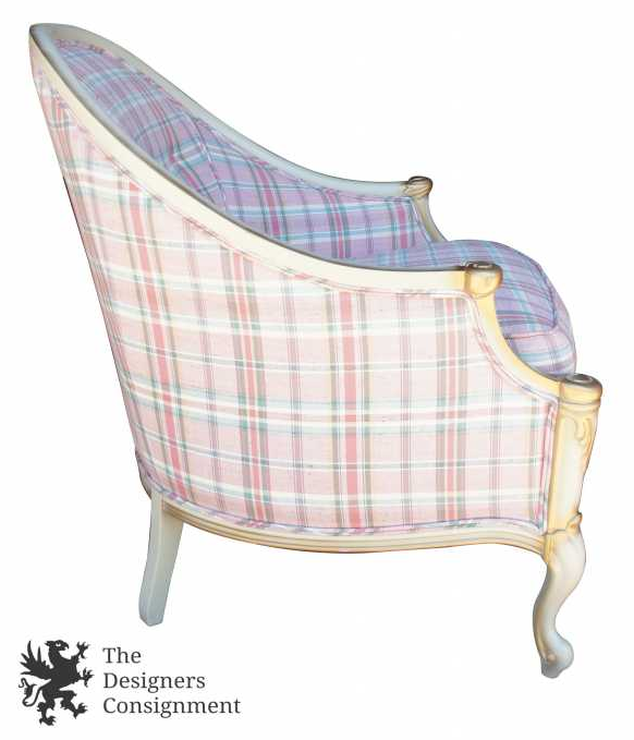 A lovely chair from Bassett Furniture's Cartier Collection. Features a French Provincial design. Finished in bisque. The chair is upholstered in a pink plaid with greens and whites