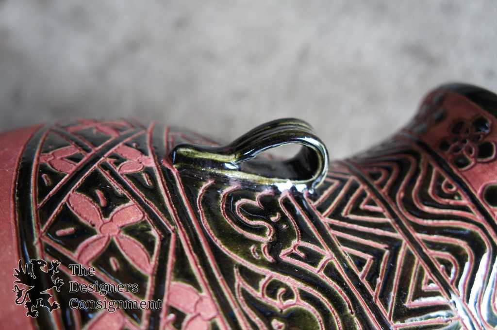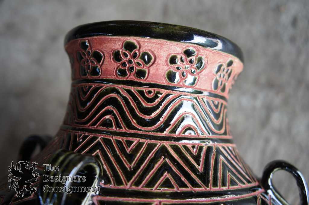 An attic black figure neck amphora style jar. Peach with high gloss black figural music scene. Men and women are shown dancing with instruments. A neat addition to any setting.
