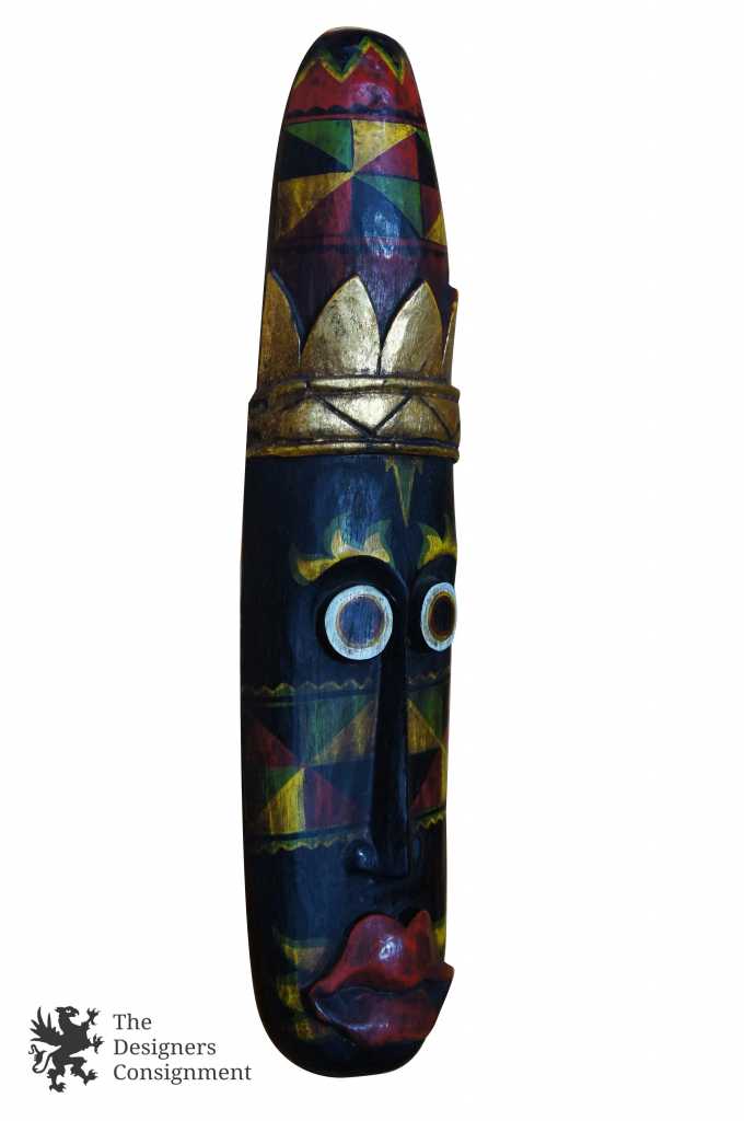 24" Primitive Tribal Carved Wall Hanging Mask Painted Geometric Design Vintage