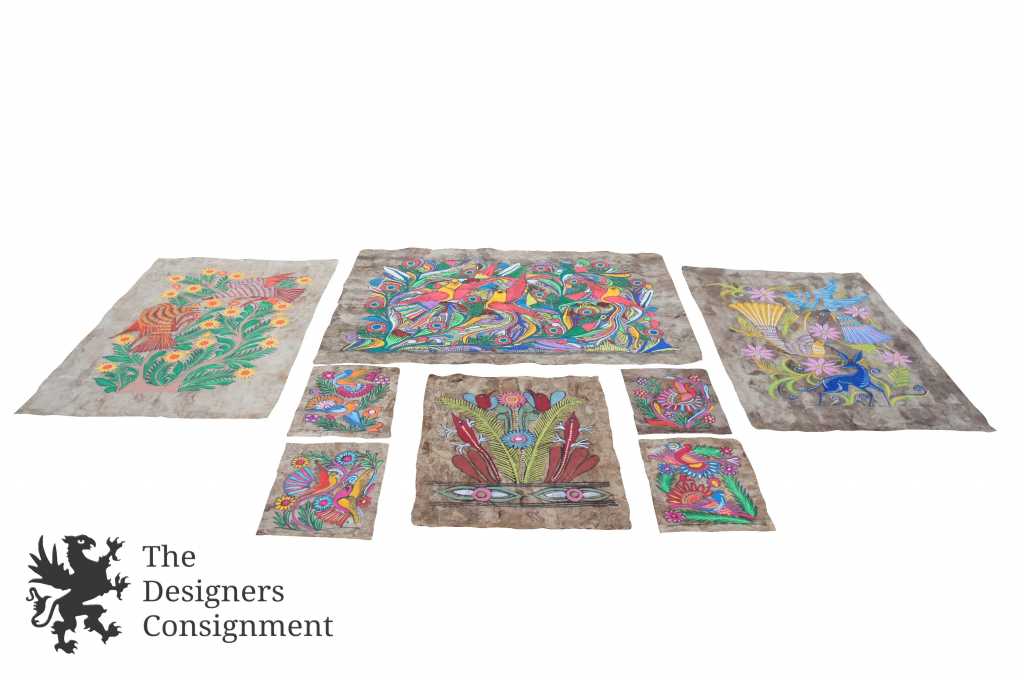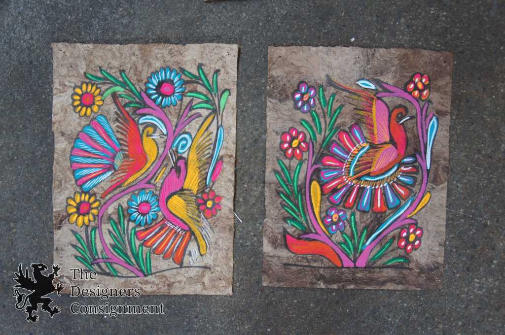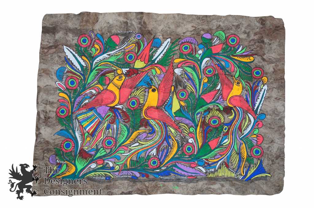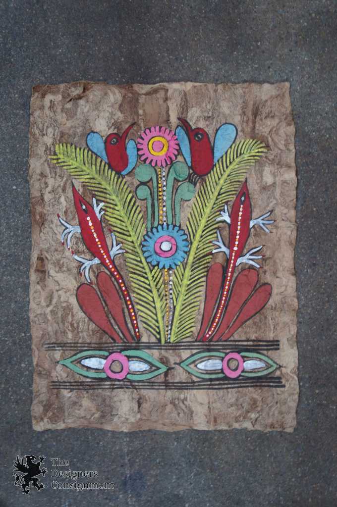 Amate tree bark art. A hand painted textile with vibrant color showing birds and flowers.