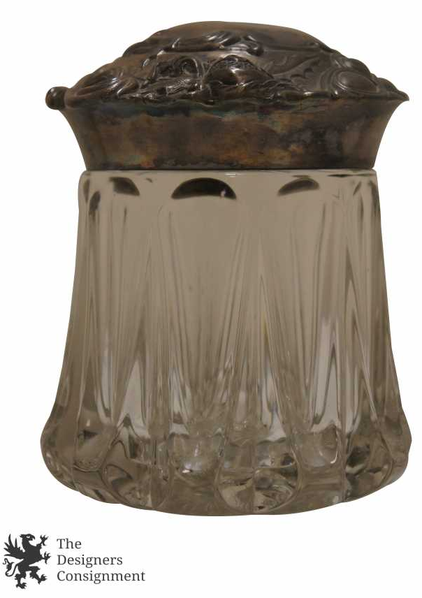 A beautiful antique cut glass tobacco humidor jar. The lid is not marked, but appears to be sterling with an elaborate floral repousse pattern. A neat addition to any collection.