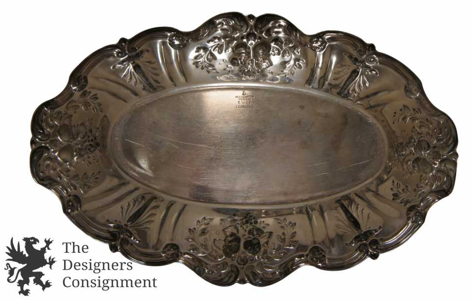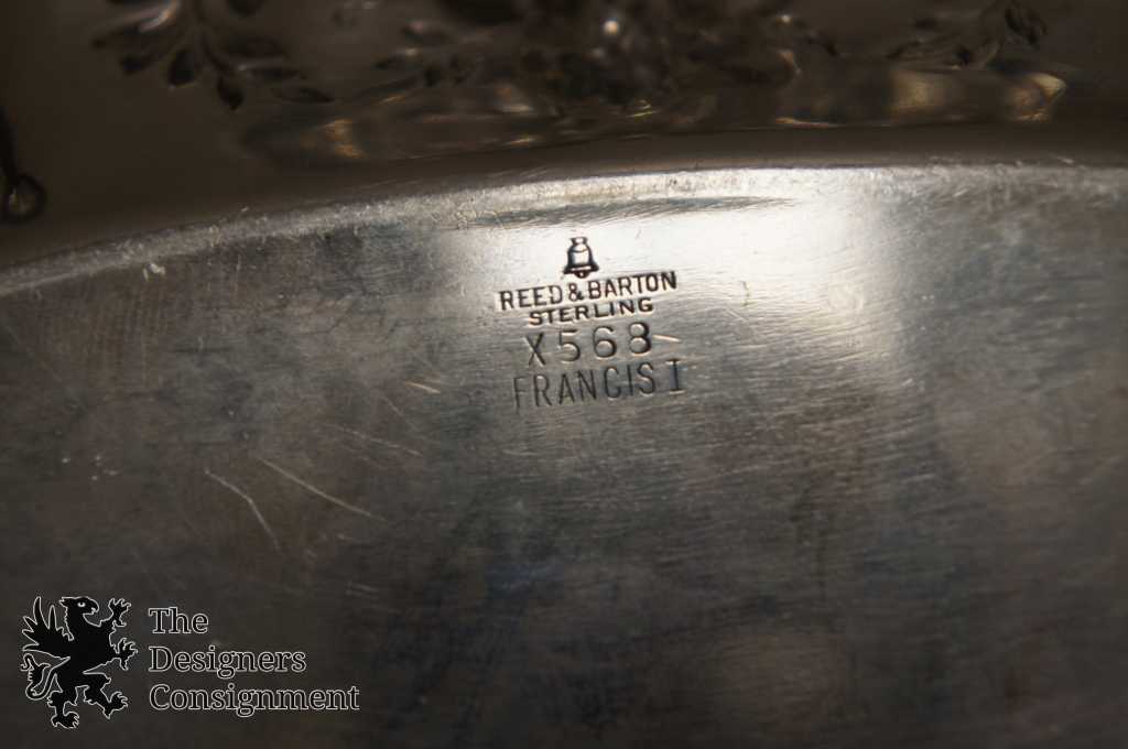 Here we have a sparkling .925 sterling silver Reed & Barton bread tray. The popular Francis I pattern was originally designed by Ernest Meyer for Reed & Barton in 1906. Featuring exquisitely rendered flora themes throughout including various flowering plants, and edible fruits such as grapes and pomegranites framed in leafy 'olive crown' arrays, and intertwined with a sensous scalloped rim with 'scroll' details. Marked Reed & Barton Sterling, X568 Francis I