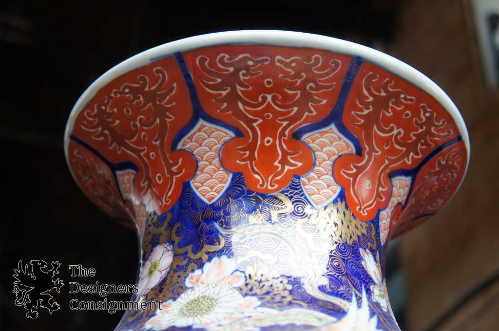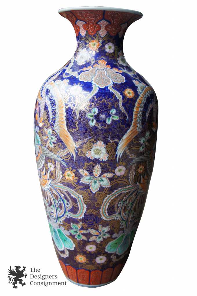 Exquisite antique Famille Rose blue floor vase. Meticulously detailed in red, blues, oranges, green and gold. Each side shows 2 elaborate phoenix's gazing into each others eyes. Mouth of the vase shows an elaborate floral motif. A gorgeous overall piece that will make a statement in any setting.