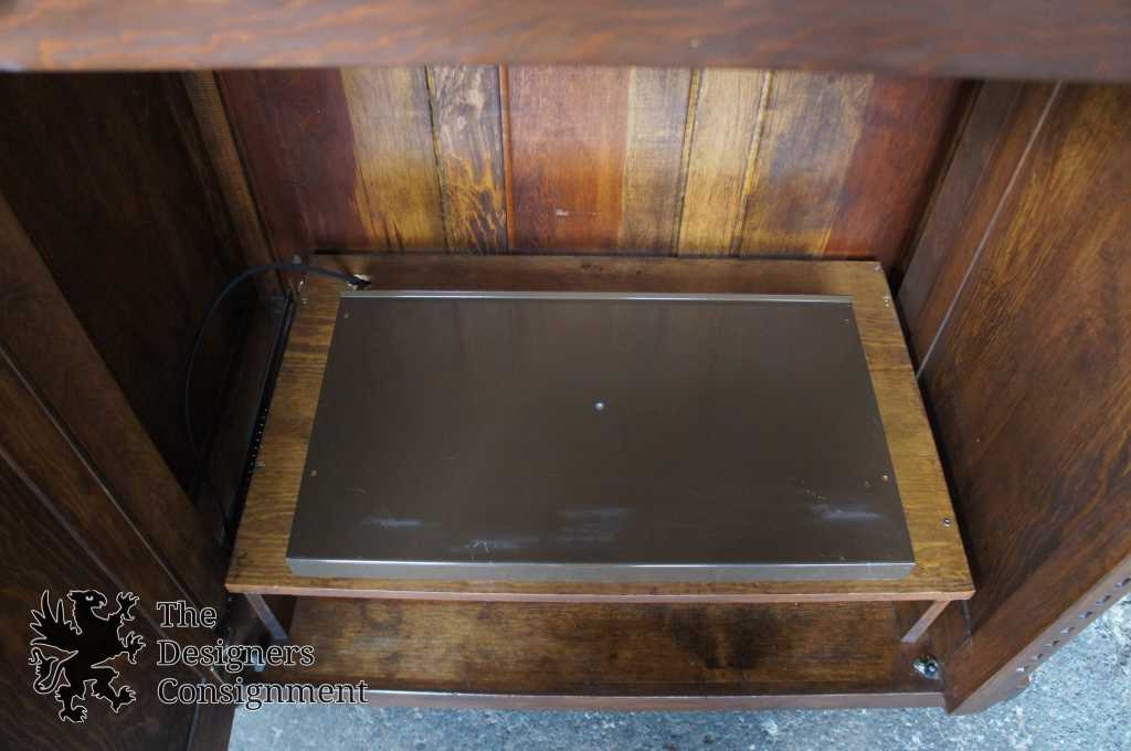 A handmade oak TV/ media cabinet. Circa 1990s. Designed in a southwestern styling with carved design elements and rustic iron hardware. when open doors easily recede into the cabinet. Interior has an elevated stand with under-storage for electronics and a swivel top. This piece could easily be re-purposed and used as a bar cabinet. A neat addition to any setting.
