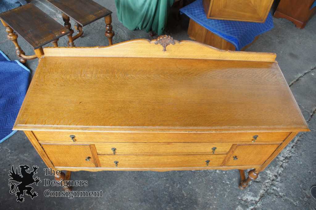 Circa 1920s buffet by Rockford Superior Furniture Co. Made from quartersawn oak with a serpentine backsplash and lower front apron. Backsplash accented with a scalloped flourish drawing warmth and synchrony with the knocker style drawer pulls. Features a larger upper drawer that spans the length of the piece followed by 2 smaller tiered drawers. The centrally located drawer is felt lined with compartments. Exterior doors open for additional storage. The buffet features turned legs that are braced by an H stretcher. A gorgeous piece that will make a neat addition to any setting.