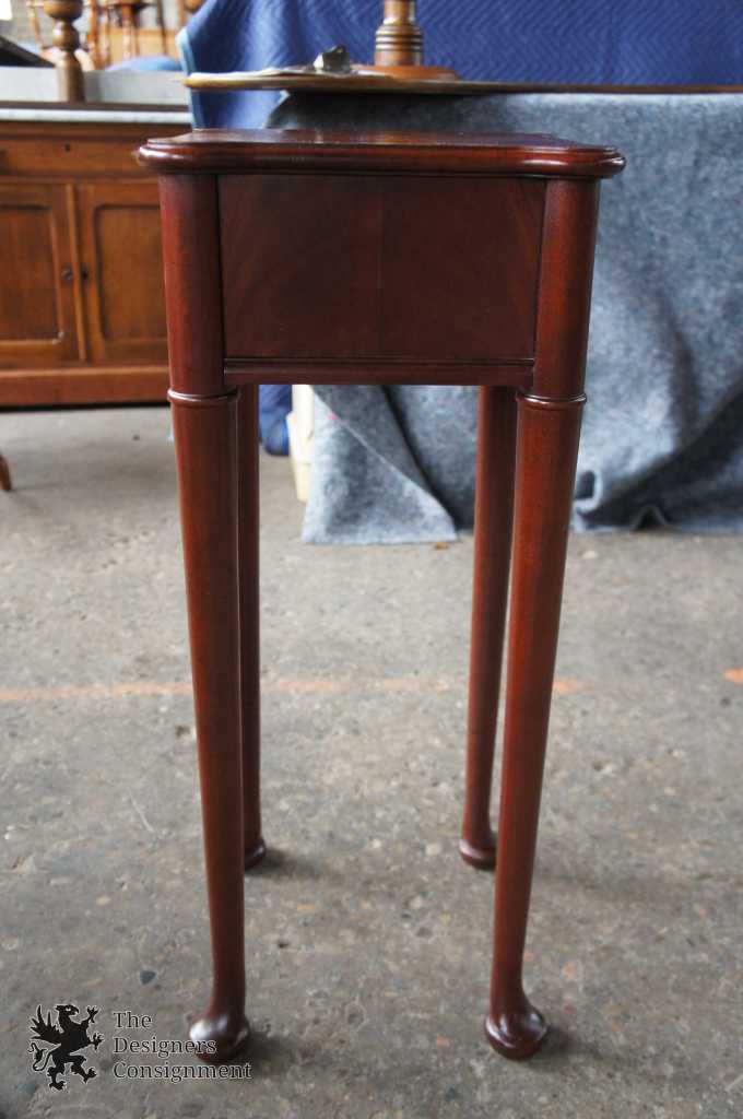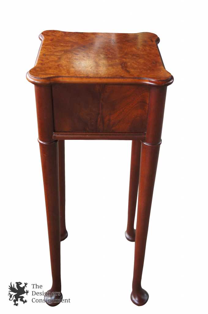 Queen Anne style side table. Made from Mahogany with a flamed front, burled turtle top and long tapered legs with pad feet. Includes one dovetailed drawer with brass hardware. The perfect accent piece for any setting. We were unable to determine the maker, however it is stamped along the bottom.