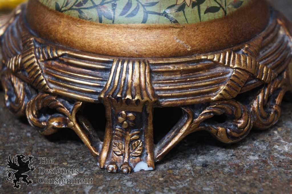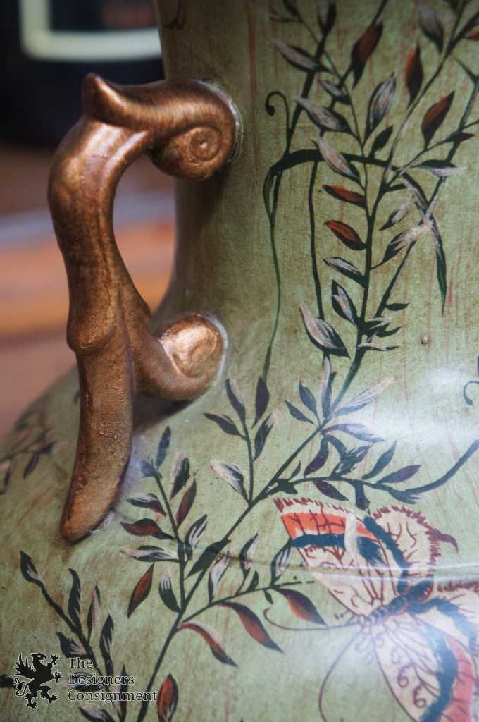 A beautiful pair of french inspired table lamps. Elegantly painted with a green forest like scene showing butterflies and dragonflies. Each lamp is urn/ vase shaped with handles, and fixed to a faux gilt base. Each base shows Louis XV style characteristics. A neat overall pair that will look great in any setting.