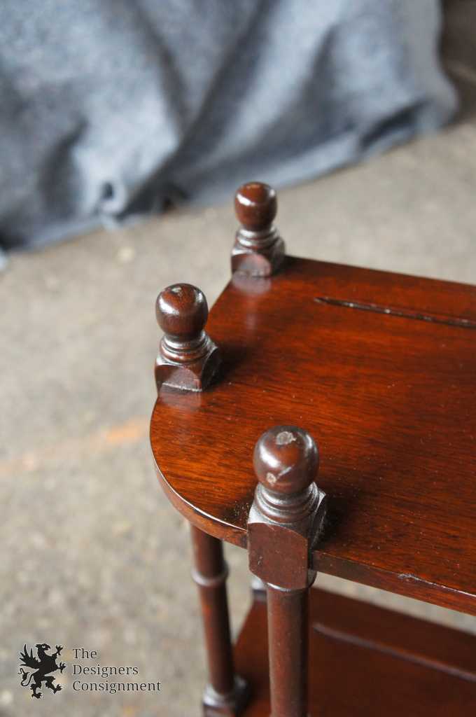Traditional wall hanging display. Made from Mahogany with crescent shape. Features a campaign style with spindled supports with a bambooe design. Each of the 3 shelves has a groove along the back for plate display. A neat addition to any space.