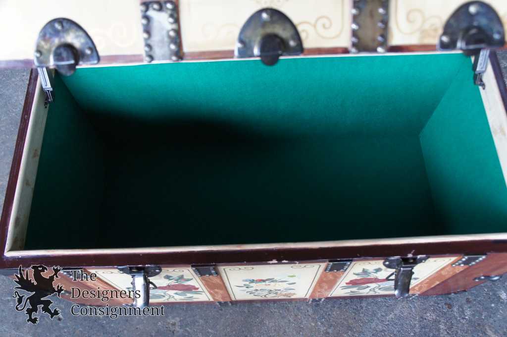 Beautiful hand-painted trunk with riveted metal accents. Felt lined for ease of storage.