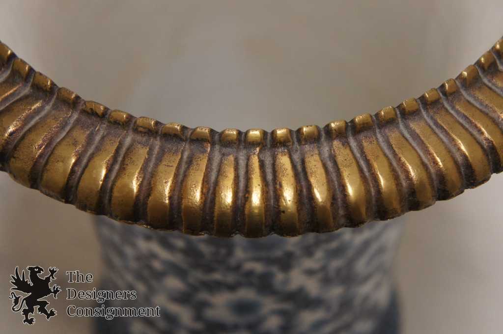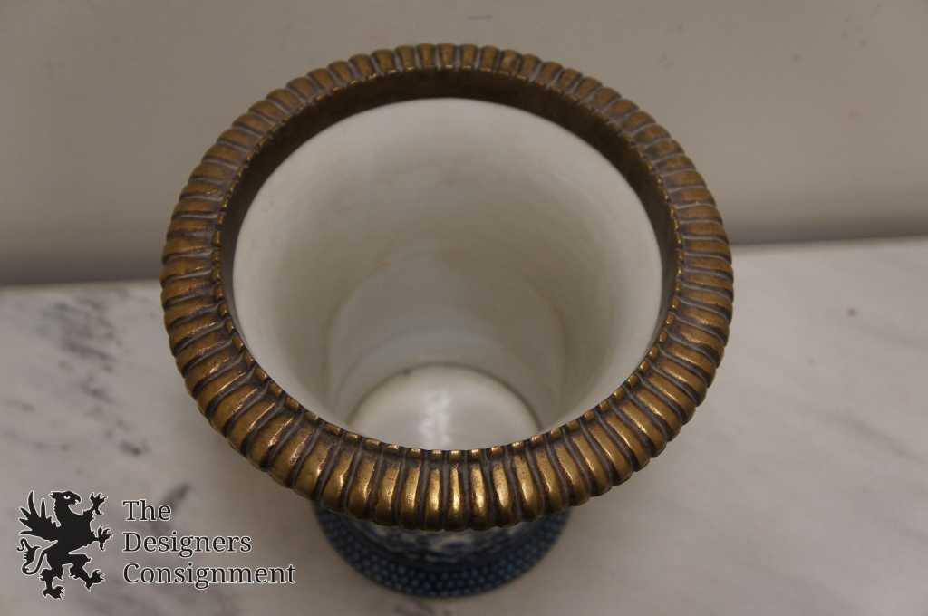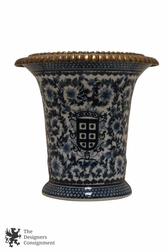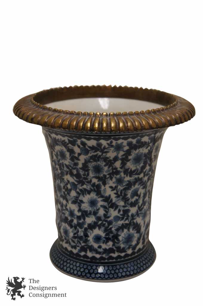 Vintage Chinese blue and white porcelain jardiniere/planter with brass/ormolu mounted rim. A great centerpiece for any space.