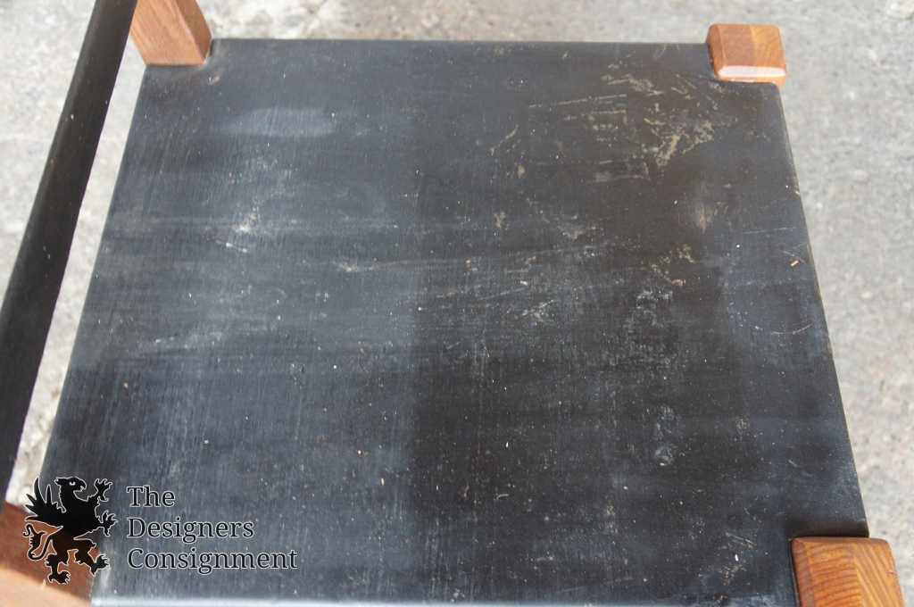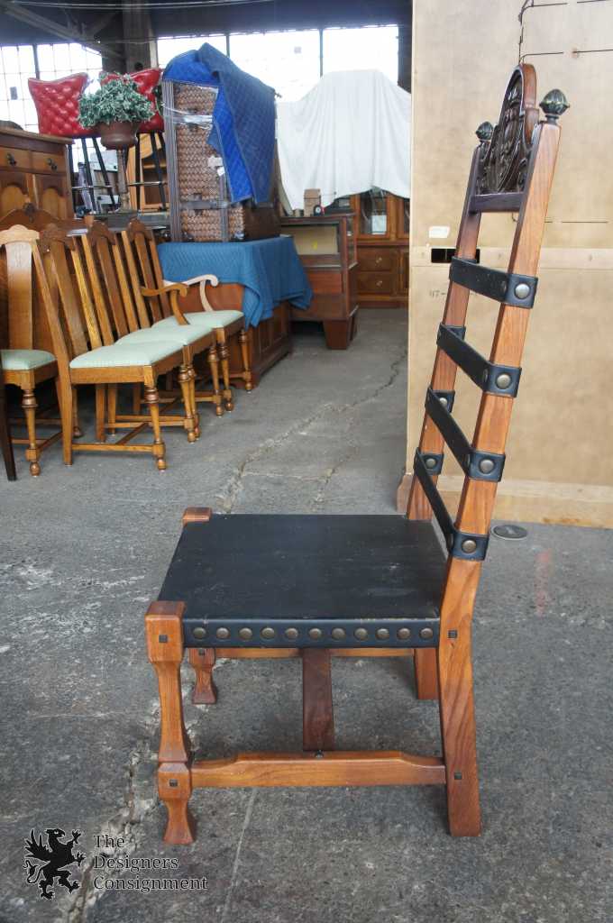 Up for consideration is a unique accent or dining chair. Spanish revival with leather studded ladder back. Made from oak with old world styling. The back features a scrolled crest with metal finials. A great addition to any collection.
