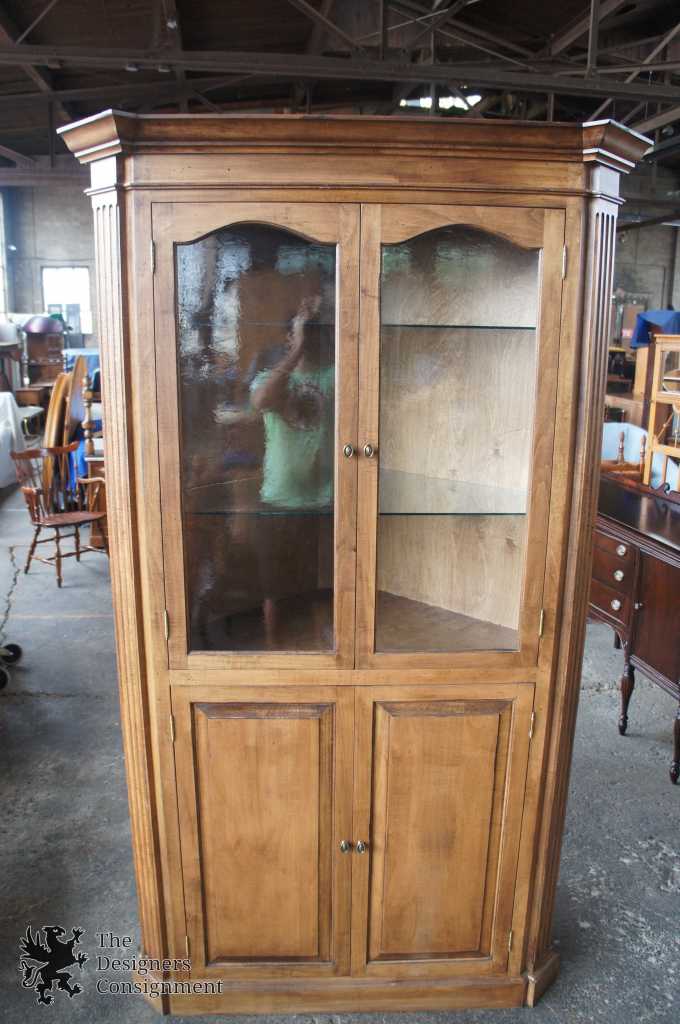 A beautiful handmade ash wood corner cabinet that will look great in any setting. Traditionally styled with fluted sides and antiqued glass. Interior is illuminated with 2 glass shelves. Lower cabinet portion opens with additional compartments for storage. This piece ships via White Glove Service with hand delivery in home.