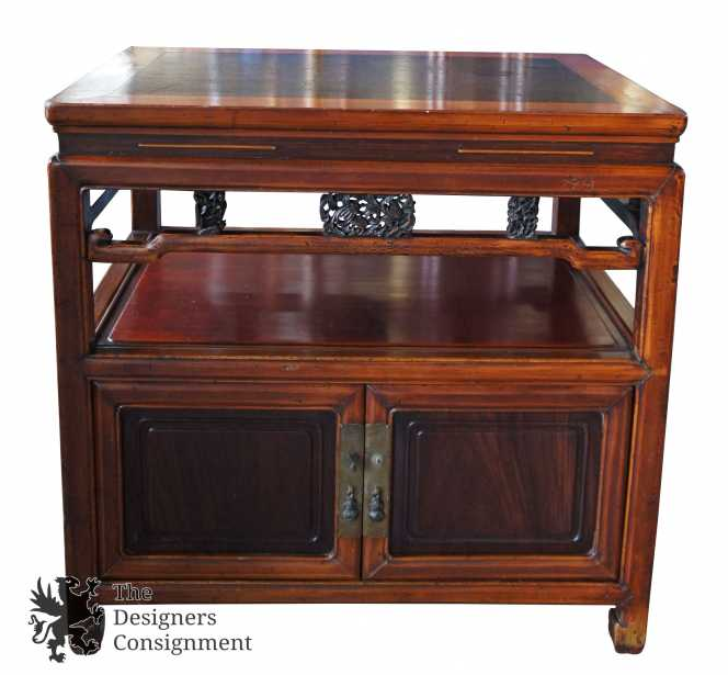 Stunning 19th century rosewood 2 door cabinet. Ming style with 2 tone designed finish. Features a floral carved apron, brass embossed hardware and mortise and tenon joints. The doors along the bottom are removable allowing for an open or closed design. A great accent piece for any setting.