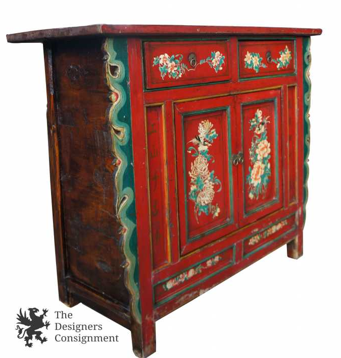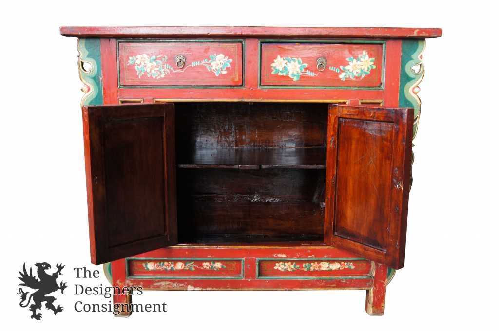 Circa 1850-1899 Chinese Qing dynasty altar cabinet. Made from rosewood with hand painted detailed. Includes 2 hand dovetailed upper drawers and lower cabinet with shelf. Features serpentine carved sides, brass hardware and a floral bird scene. Doors are easily removed in case you're looking for open shelving. An exquisite piece that really stands out from the crowd.