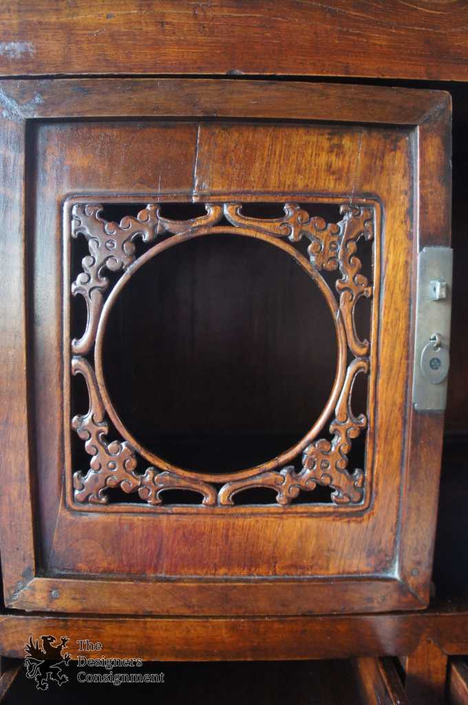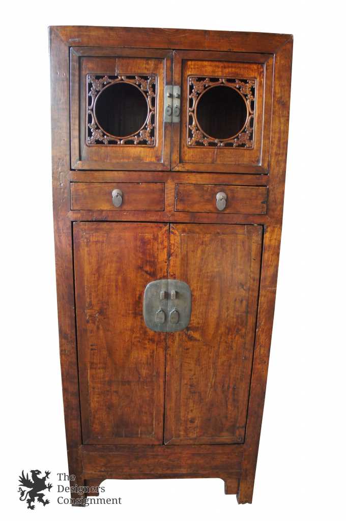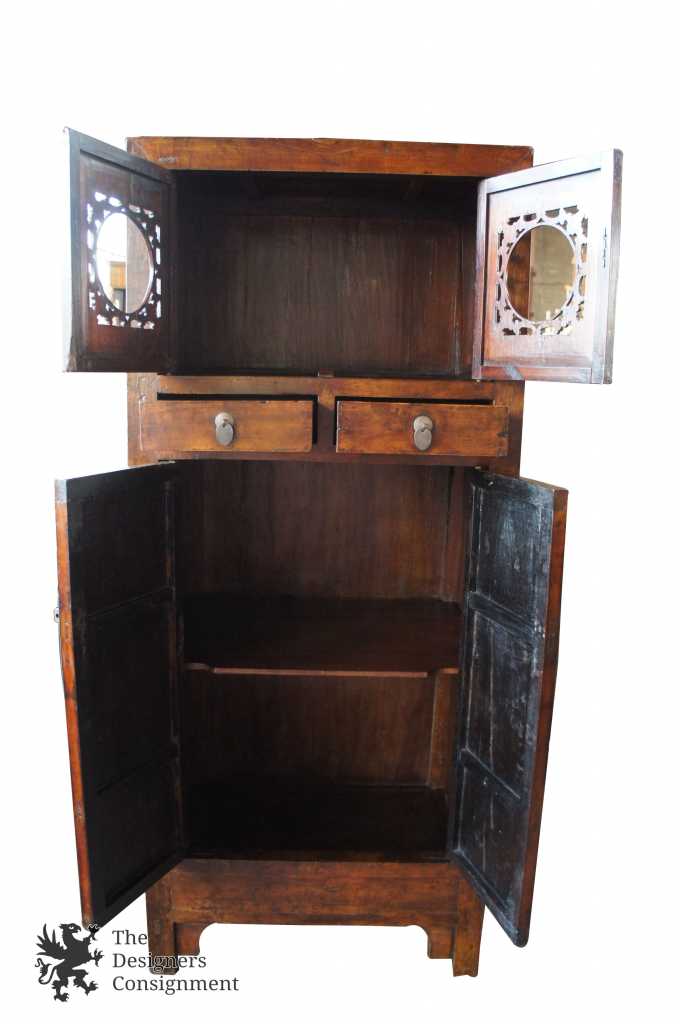 A gorgeous modern reproduction of a Chinese compound cabinet. The compound cabinet allowed for a clear division of garments. Hats and out of season clothes were generally stored in the upper half, while everyday garments and bedding went into the lower half. This cabinet was made from rosewood around the 1970s. Features removable pierced doors along the top, two central drawers and lower cabinet section with shelf. Hanging bar could be added to the bottom for garments. The cabinet is made in classic Chinese styling with mortise and tenon composition. A wonderful addition to any setting