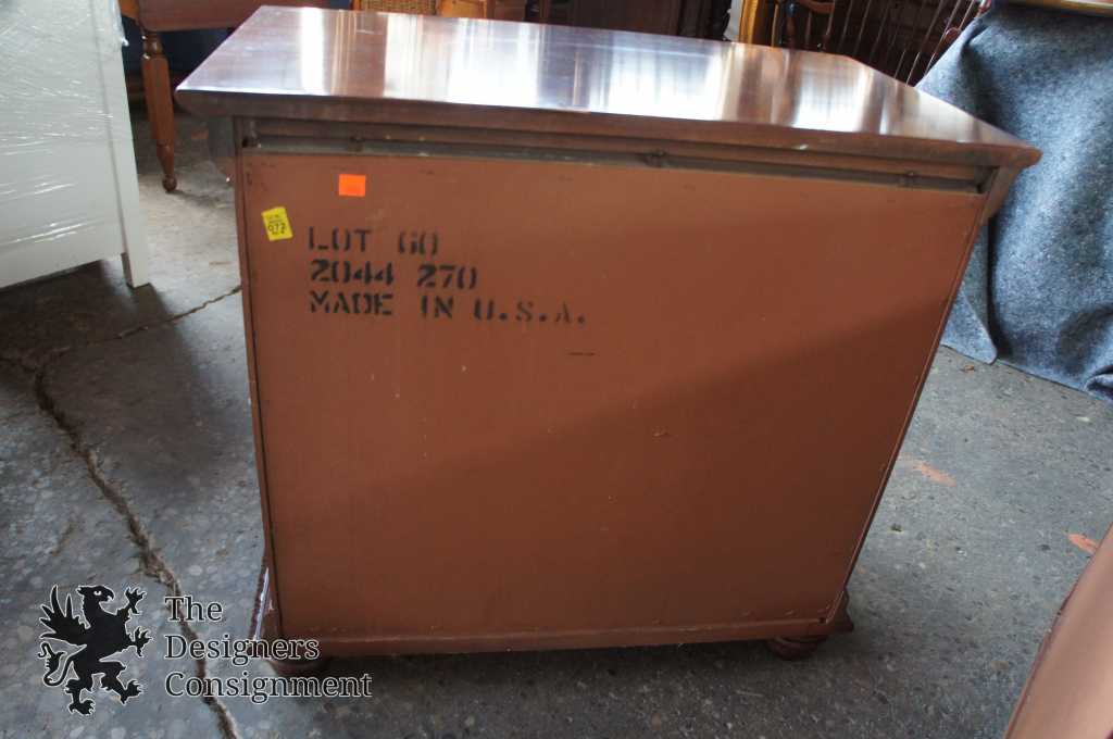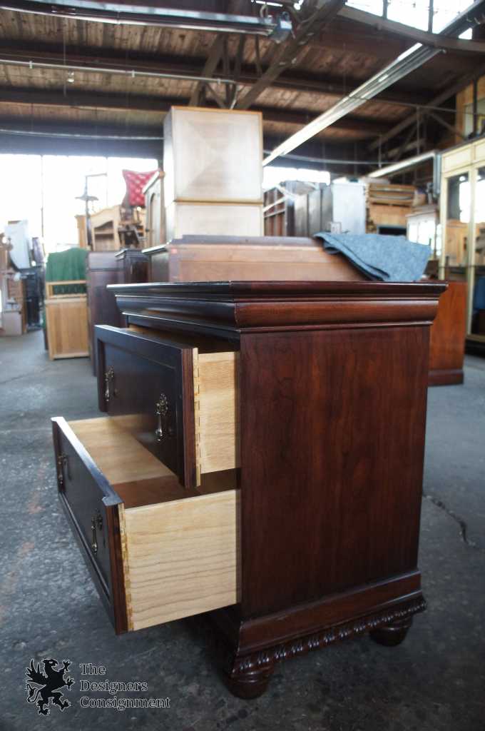 Lovely pair of cherry finished nightstands by National. Mt Airy. A company that started its roots in 1895 getting a head start on the pack before the railroad was in place. National Mt. Airy produced high quality furniture out of North Carolina furniture until the 1997 when their factory burned down. These nightstands feature 2 dovetailed drawers with brass hardware and bun feet. Lower apron shows gadroon carved accents. A neat addition for any bedroom setting.