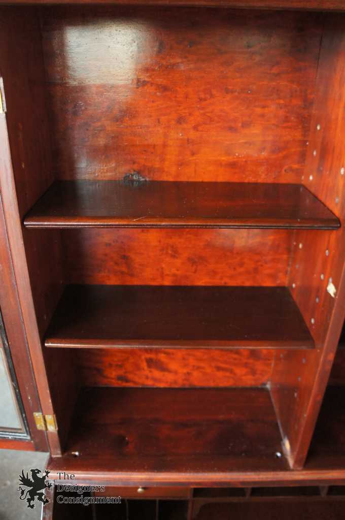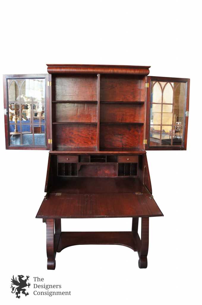 Early 20th century secretary with bookcase. Made from Mahogany in classic empire styling with a curved front and harp shaped legs. Bookcase shows a flare of Gothic styling with the fretwork along the doors. Interior has four adjustable shelves, drawers and letter compartments. A nice robustly sized cabinet that will make a statement in any setting.