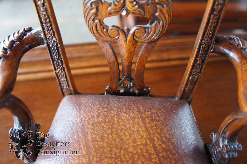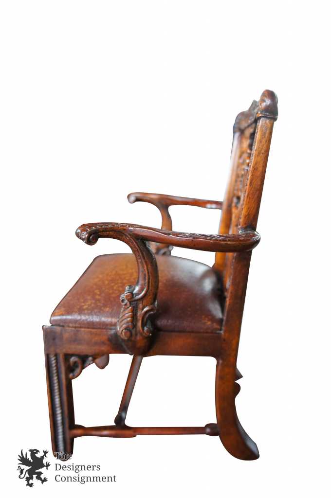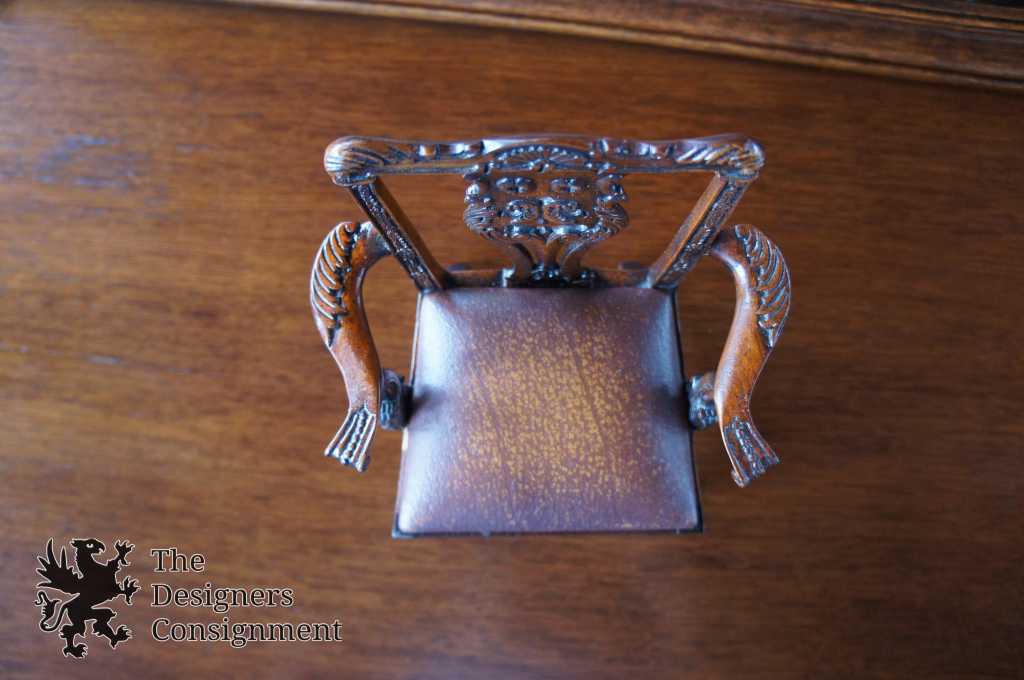 A beautiful Chippendale style miniature/dollhouse arm chair. Made from Mahogany with carved accents and a leather seat. A neat piece for any collection.
