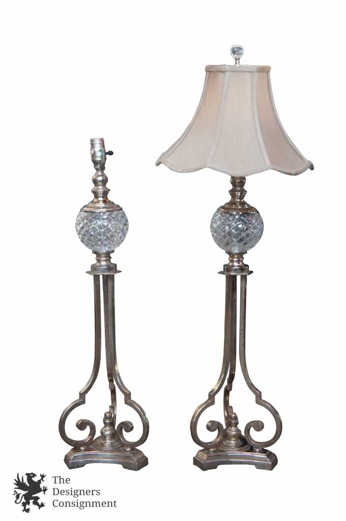 Lovely pair of Buffet or Table lamps by Uttermost. Forged metal with a tripod shaped base and french design. Features a distressed silver finish that leads up to a crystal cut globe center. Shades are scalloped, and finials match the center. A neat pair for any setting.