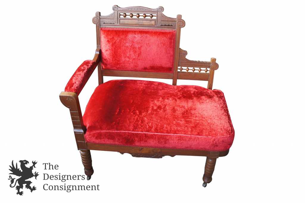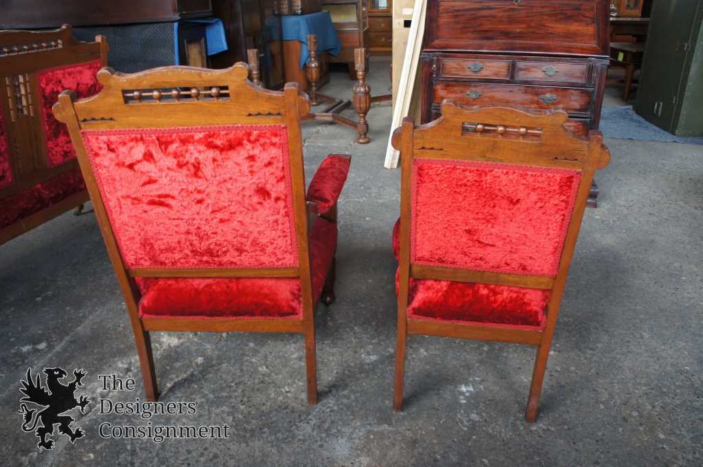 A beautiful late 19th century Victorian parlor set. Made from walnut in eastlake style with carved and burled accents. Features a settee, gossip bench, gentleman's and side chair. Finished in a red upholstery. A neat addition to any setting.