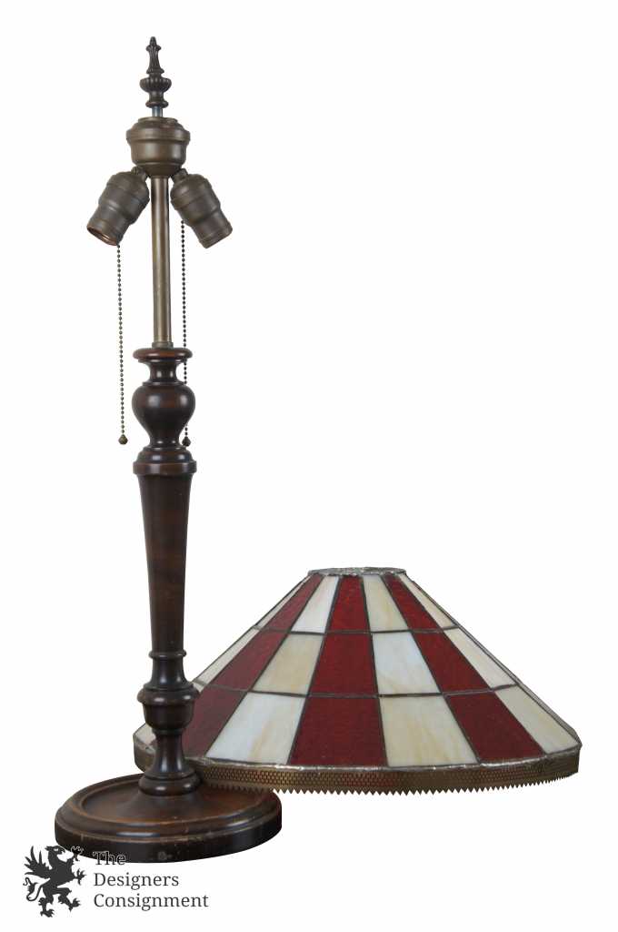 Features a wooden lamp with dual sockets and red/white candy-striped style shade.