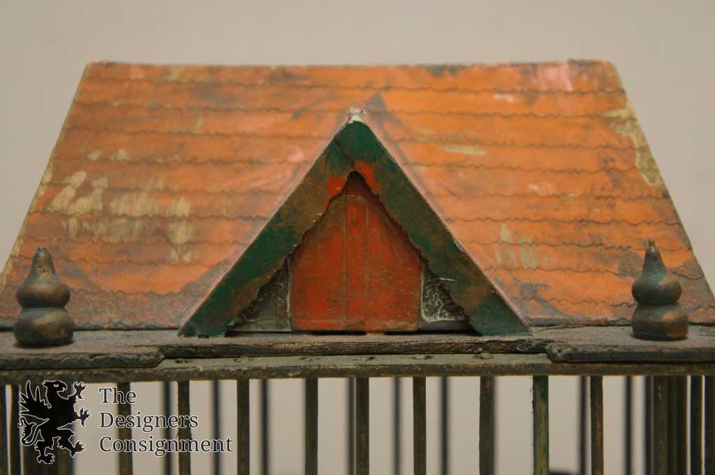Miniature Victorian era footed birdcage. 2 pieces with removable top. Features a central sliding gate along the front and brass brackets along the back for hanging.