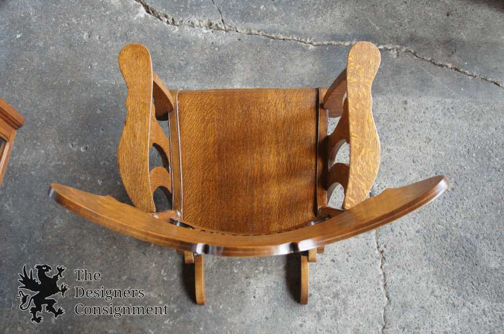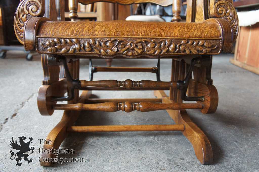 Late 19th century Victorian platform rocker. Mission style with a shield back leading down towards spindles and a bentwood seat. Features a carved front with french inspiration showing acorns, leaves and bell horn design over a ribboned accent. Sides show a pressed oak floral pattern. The platform design incorporates a cast iron swing support that was patented in May 29th, 1888. A beautiful work of art that will be a great addition to any setting.