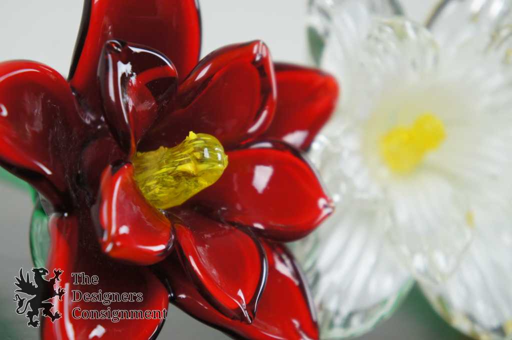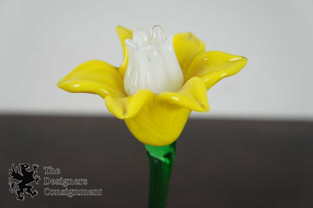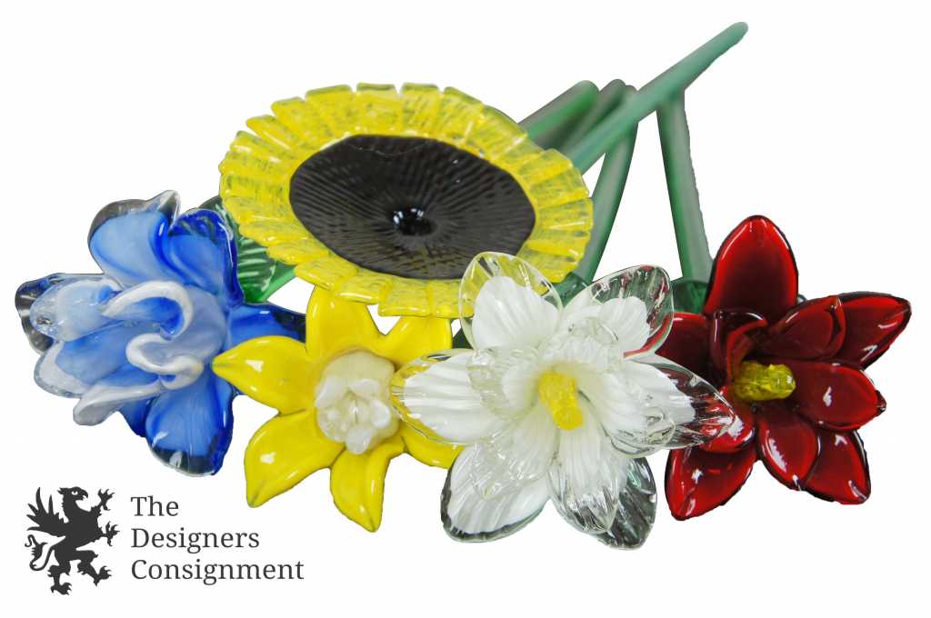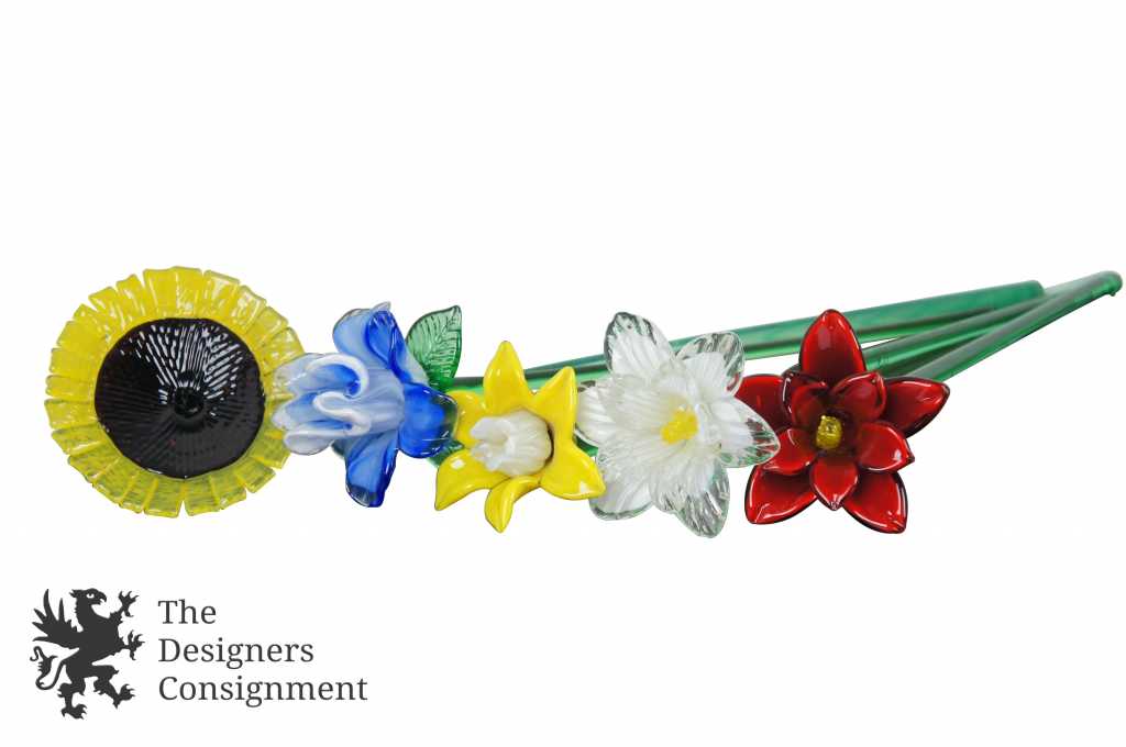 Murano hand blown flowers. Features a daffodil, blue flower, red flower, white flower, & sunflower. Perfect for display individually, or together in a vase.