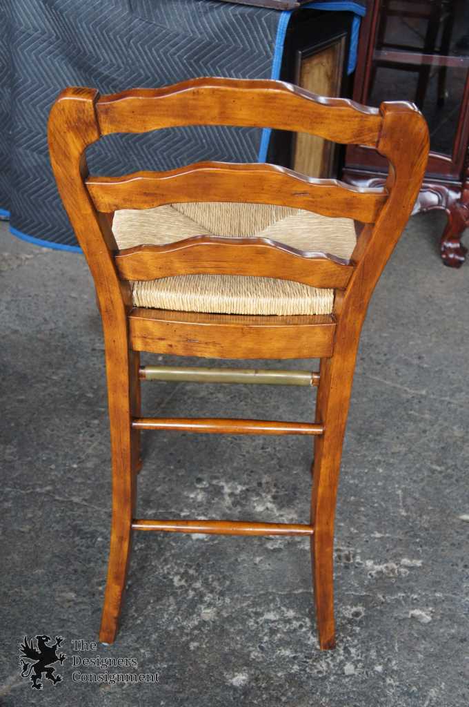 6 touchstone collections bar height stools. French country styling with a serpentine ladderback and rush seats. Each chair has a rush seat and brass foot rest. A neat addition to any bar