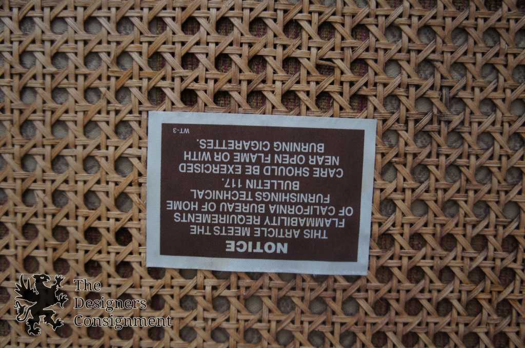 Baker Furniture Barrel Back Chair. Features a cane back and seat with checked cushion. Dark wood tone with saber legs, brass capped with casters. A great occasional piece for any setting.