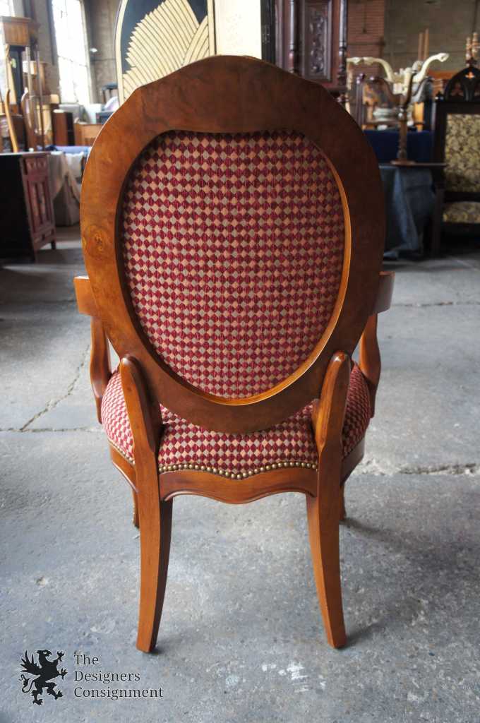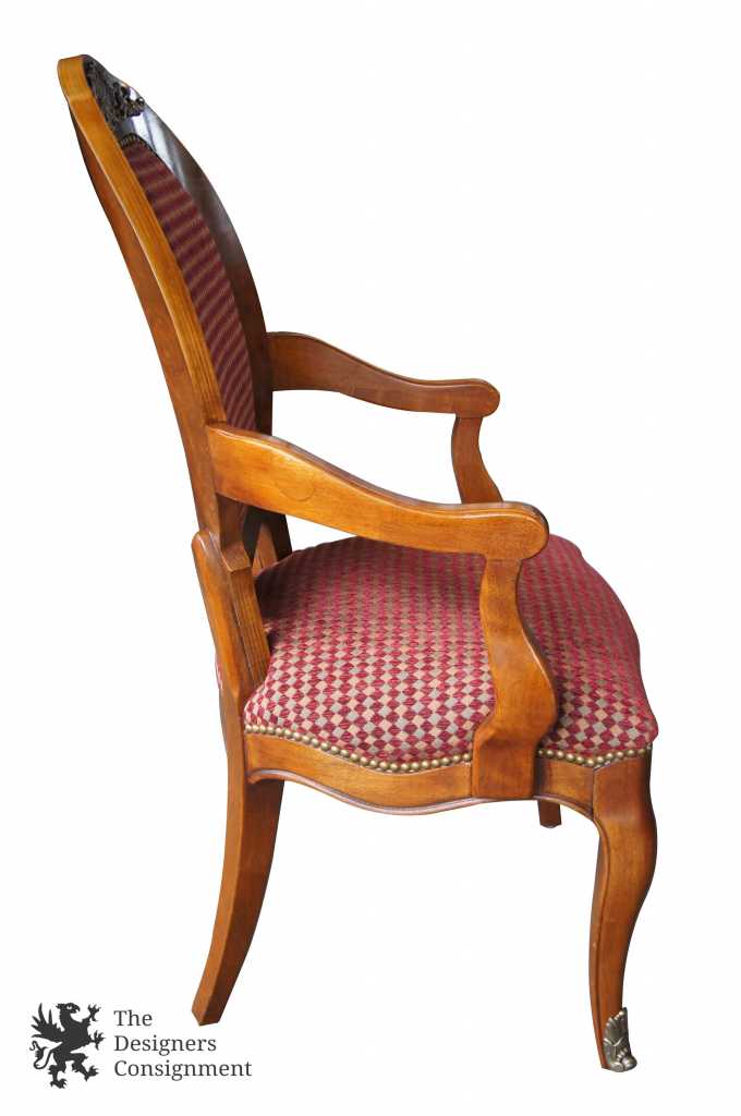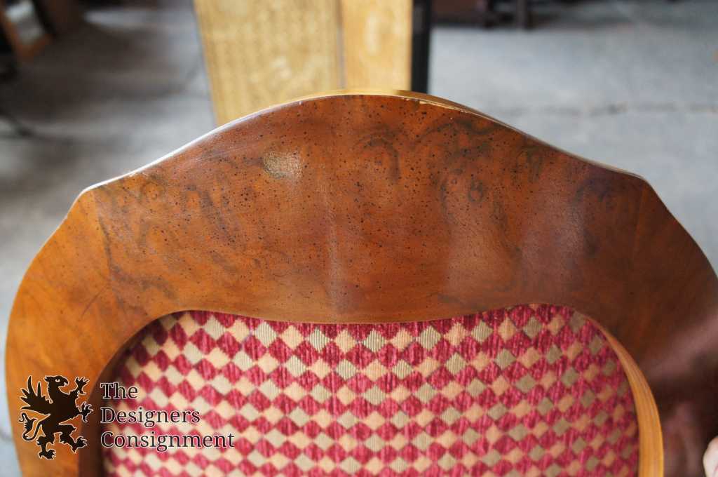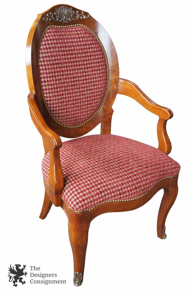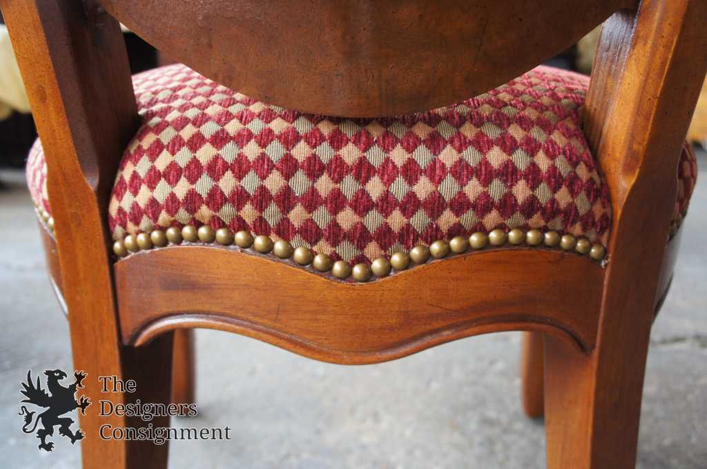 Henredon Olive wood burled chairs. Louis XVI style with brass mounted scalloped back and feet. Upholstered in a red checkered pattern with nailhead trim.