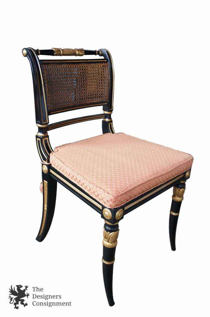 Striking and very difficult to find set of 4 Regency style dining chairs from the Baker Furniture Stately Homes Collection. Black finish with gold accents, caned backs and seats. Each seat features a removable cushions with tassels along the rear.