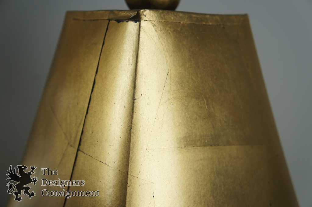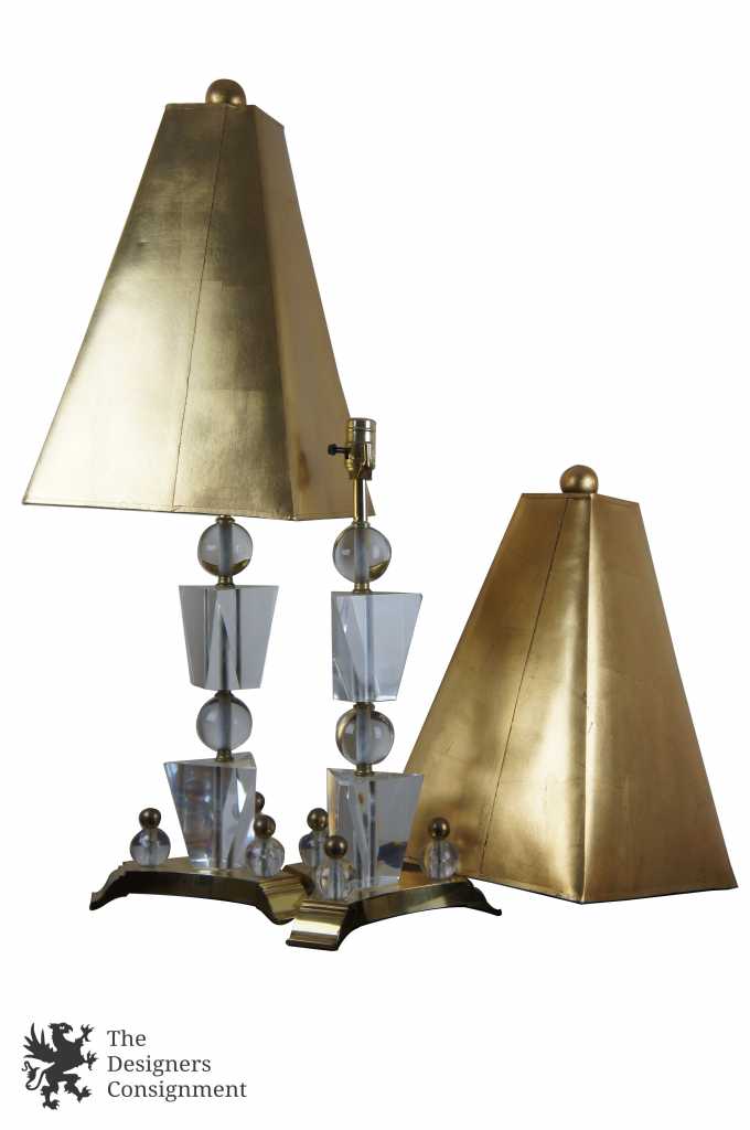 Lovely pair of art deco style table lamps. Features a geometric glass design over a brass tripod shaped base. Finished with a gold shade.