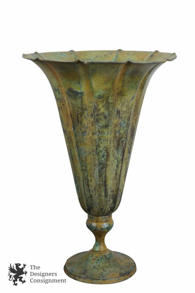 2 Art Deco Style Rustic Painted Metal Trumpet Vases Urn Fluted Green Patina 15