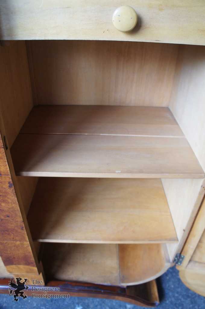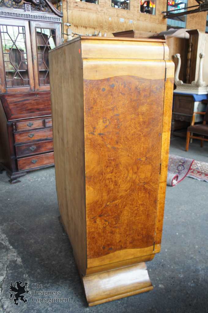Early 20th Century Art Deco Liquor Cabinet. Burled walnut veneer with two-tone front and waterfall top. Opens to five shelves and a liquor bottle drawer. Paper Label along the back marked "M & CIA". Matching sideboard and dining table available separately.